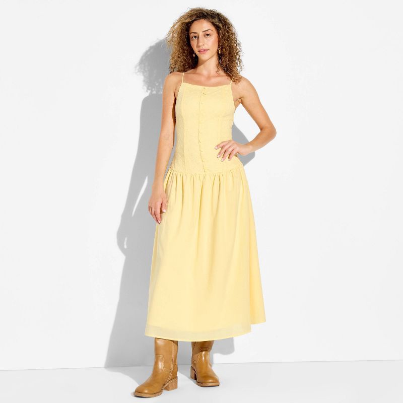 Sleeveless drop-waist A-line midi dress from Wild Fable™ in a solid shade. Features a high square-neck bodice with half-length button front and dropped waist. Adjustable spaghetti straps let you custo…