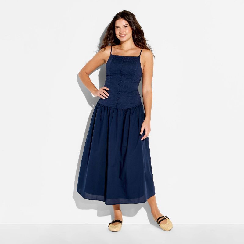Sleeveless drop-waist A-line midi dress from Wild Fable™ in a solid shade. Features a high square-neck bodice with half-length button front and dropped waist. Adjustable spaghetti straps let you custo…