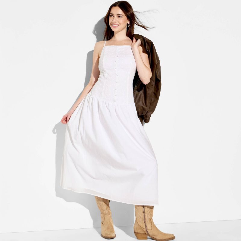 Sleeveless drop-waist A-line midi dress from Wild Fable™ in a solid shade. Features a high square-neck bodice with half-length button front and dropped waist. Adjustable spaghetti straps let you custo…
