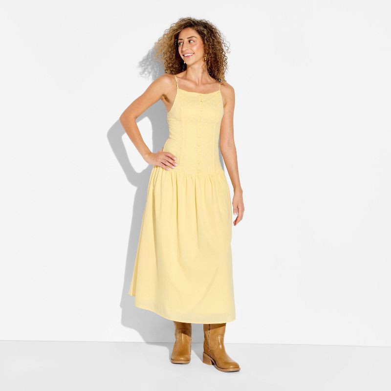 Sleeveless drop-waist A-line midi dress from Wild Fable™ in a solid shade. Features a high square-neck bodice with half-length button front and dropped waist. Adjustable spaghetti straps let you custo…