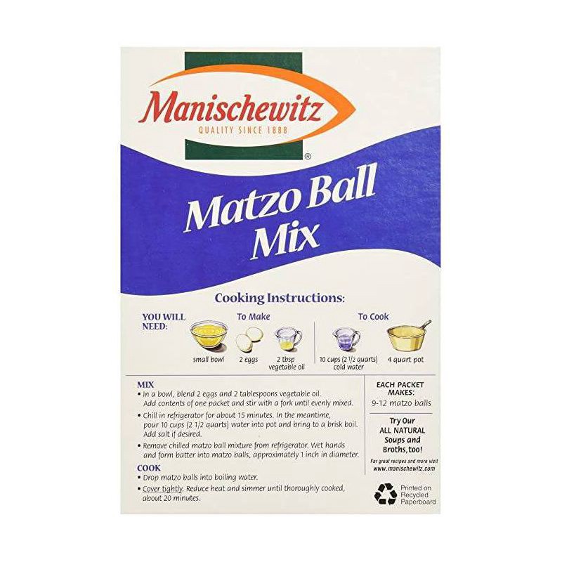 Kosher for Passover and all year round, Manischewitz Matzo Ball Mix creates perfect matzo balls for soups and side dishes. So easy to make, just add 2 eggs, 2 tablespoons of vegetable oil and fluffy l…