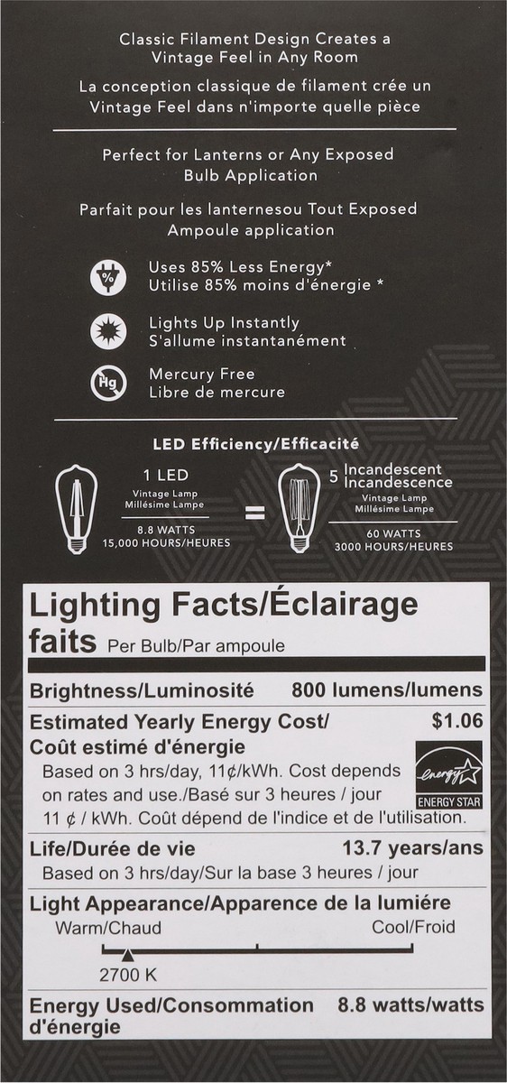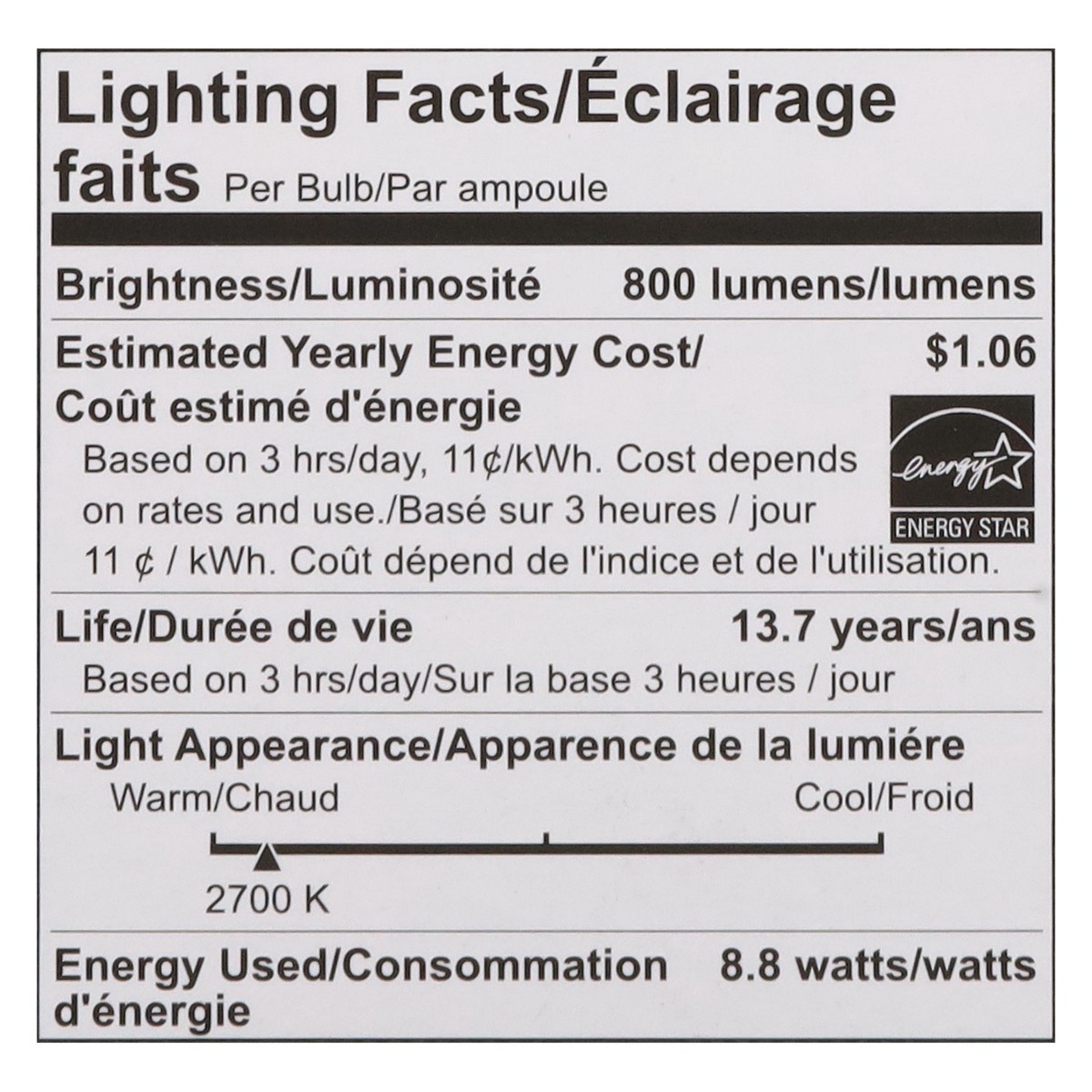 Brightness Quantity: 800 lumens. Energy Info: $1.06 based on 3 hrs/day, 11¢/kWh. Cost depends on rates and use. Package Info: 2-Pack. Bulb Info: LED. Is Dimmable. Bulb Life: 13.7 years based on 3 hrs/…