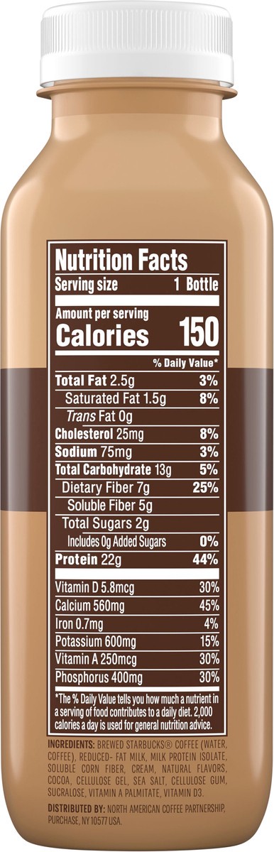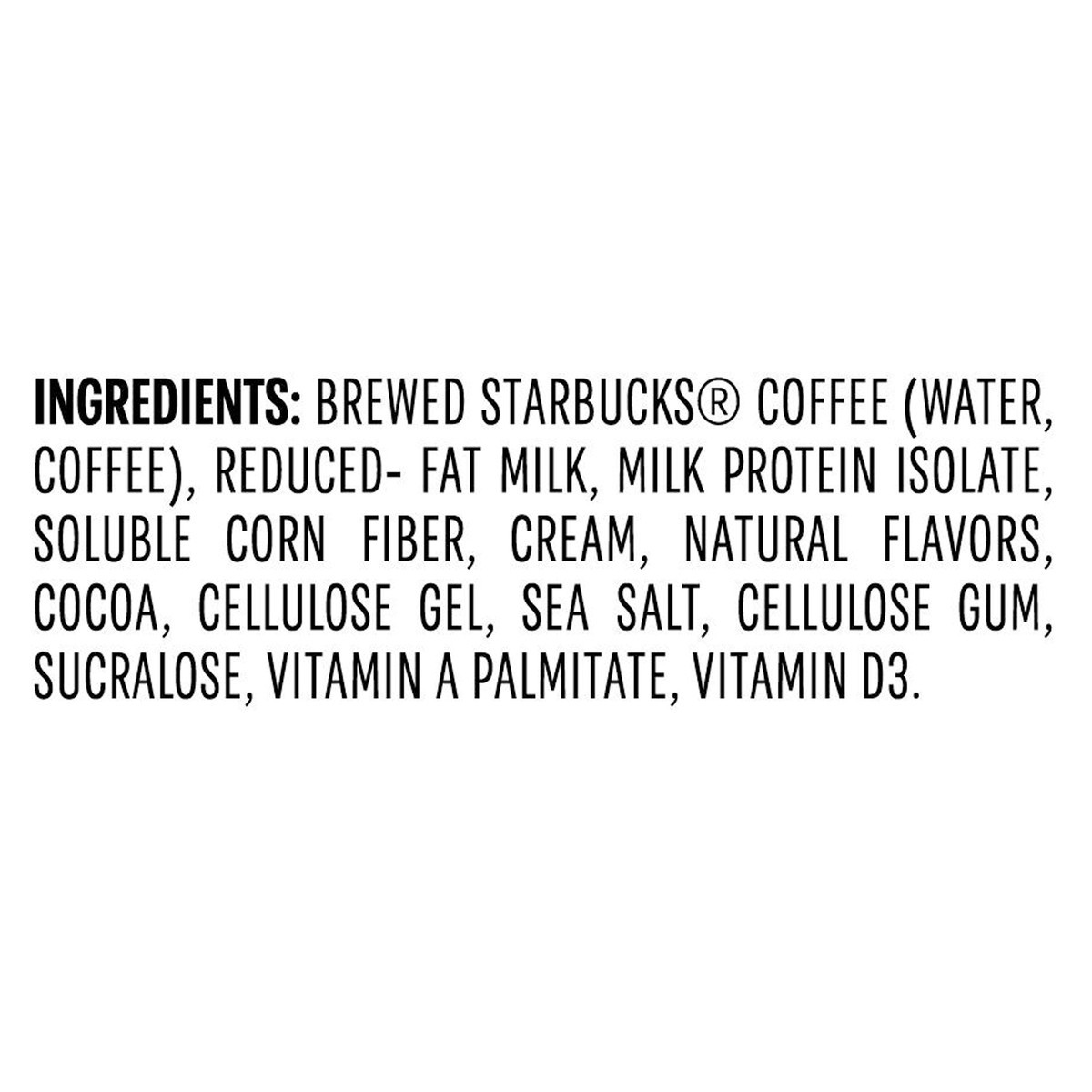 Brewed Starbucks Coffee (Water, Coffee), Reduced- Fat Milk, Milk Protein Isolate, Soluble Corn Fiber, Cream, Natural Flavors, Cocoa, Cellulose Gel, Sea Salt, Cellulose Gum, Sucralose, Vitamin A Palmit…