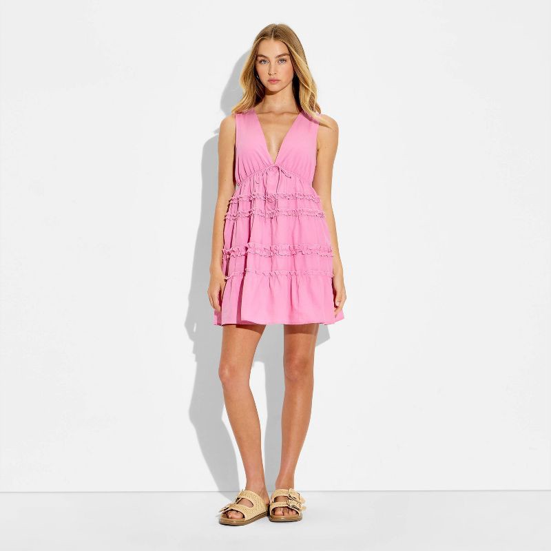 Sleeveless mini babydoll dress from Wild Fable™ with tiered ruffle accents. Designed with a deep V-neckline, empire waist with tie-front detailing and a keyhole back with button fastening. Crafted fro…