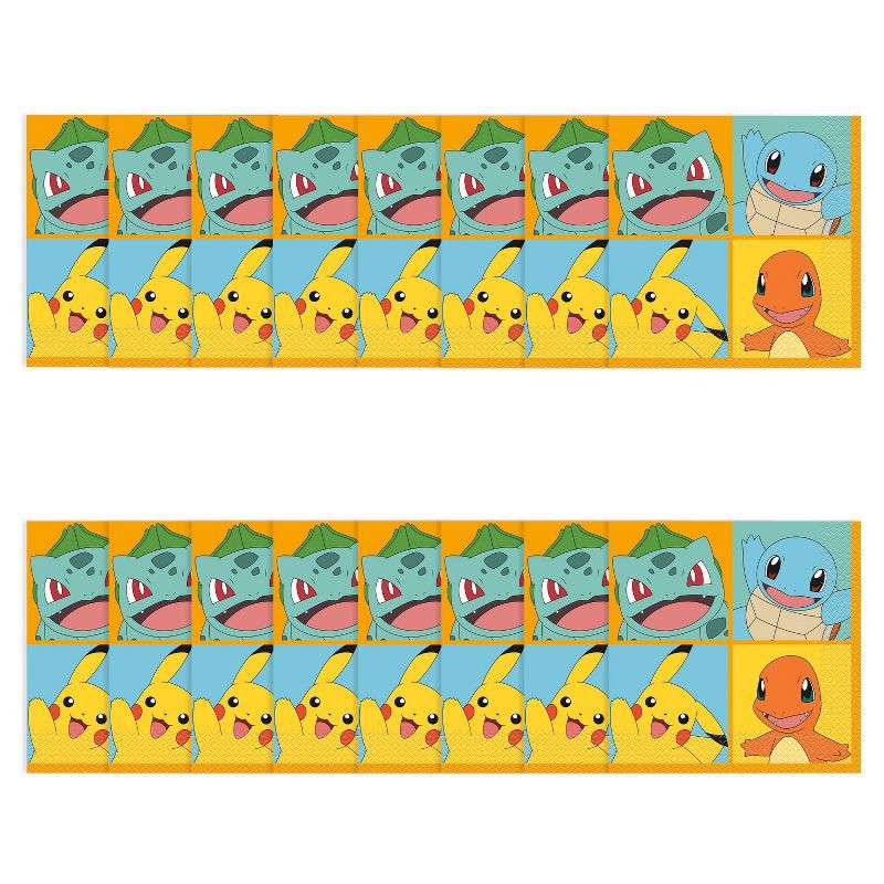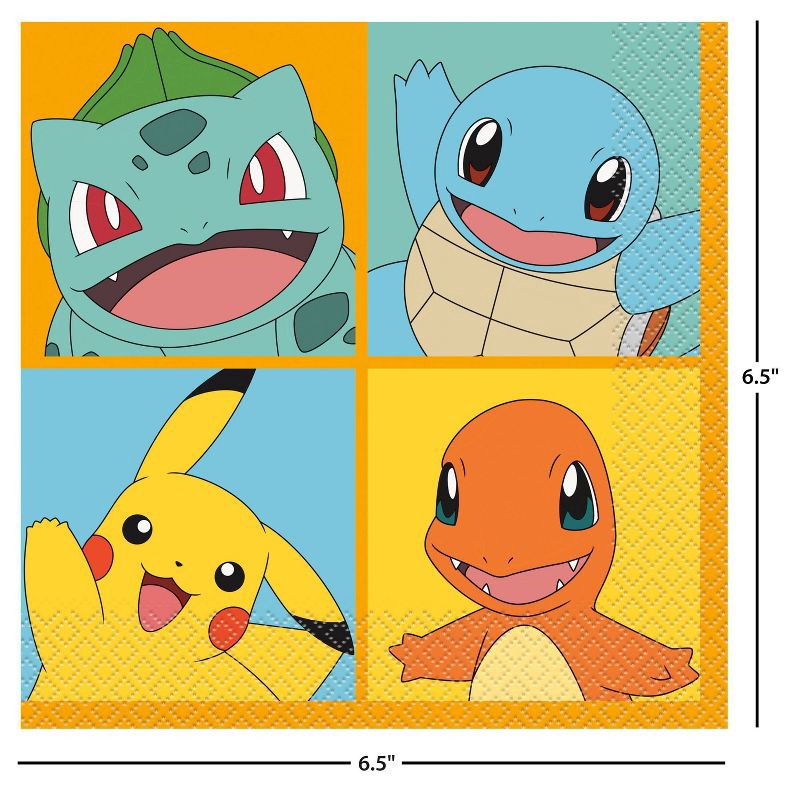 - Paper napkins feature licensed Pokémon artwork with Pikachu, Bulbasaur, Squirtle, and Charmander