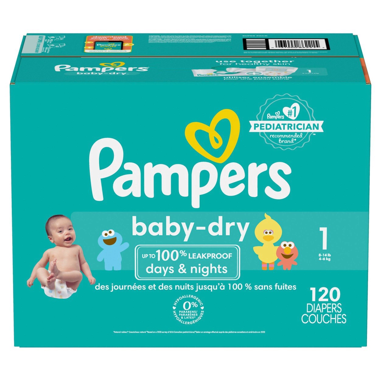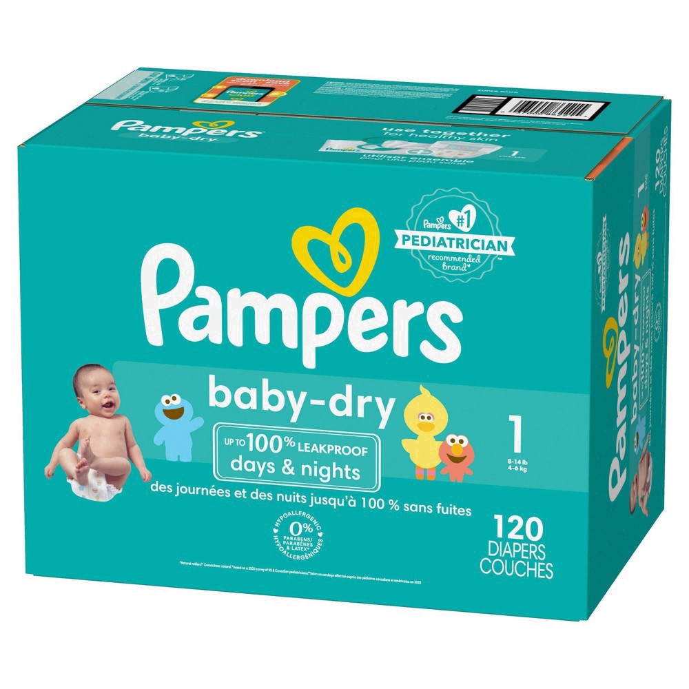 Pampers Baby Dry Diapers, Size 1 (8-14 lbs), 120 Count, Up to 100% leakproof disposable diaper