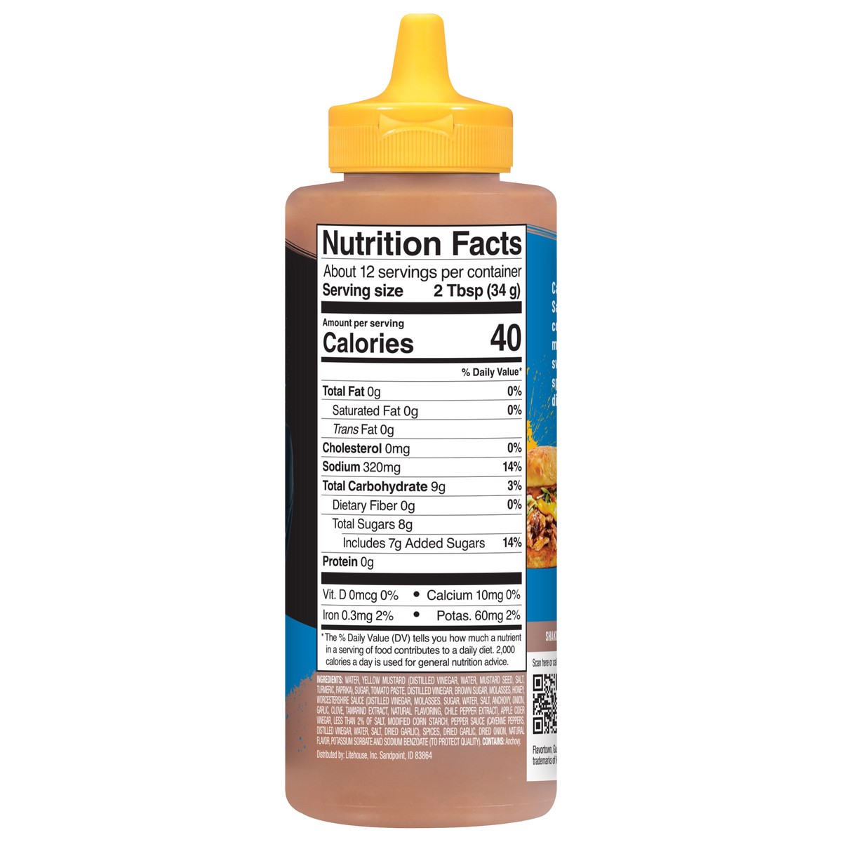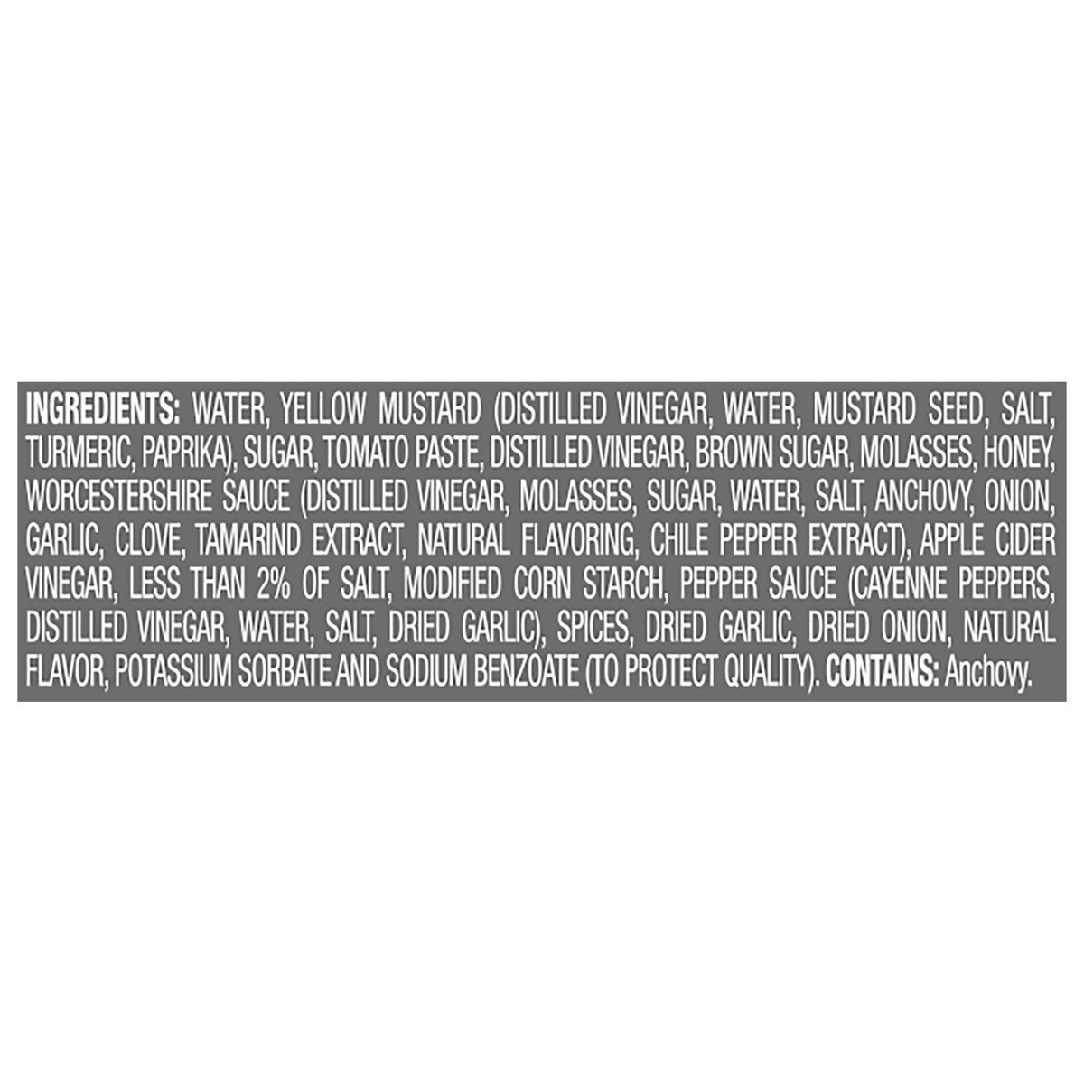 Water, Yellow Mustard (Distilled Vinegar, Water, Mustard Seed, Salt, Turmeric, Paprika), Sugar, Tomato Paste, Distilled Vinegar, Brown Sugar, Molasses, Honey, Modified Corn Starch, Worcestershire Sauc…