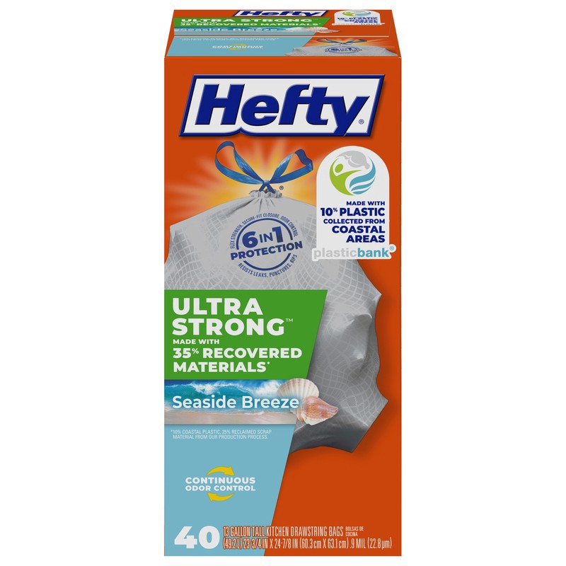 Hefty Ultra Strong 13 Gallon Trash Bags made with 35% recovered materials including 10% coastal plastic* help you tackle cleanup jobs all around the house, thanks to their Hefty! Hefty! Hefty! strengtā¦