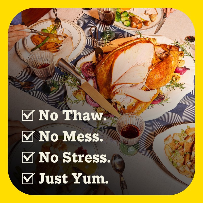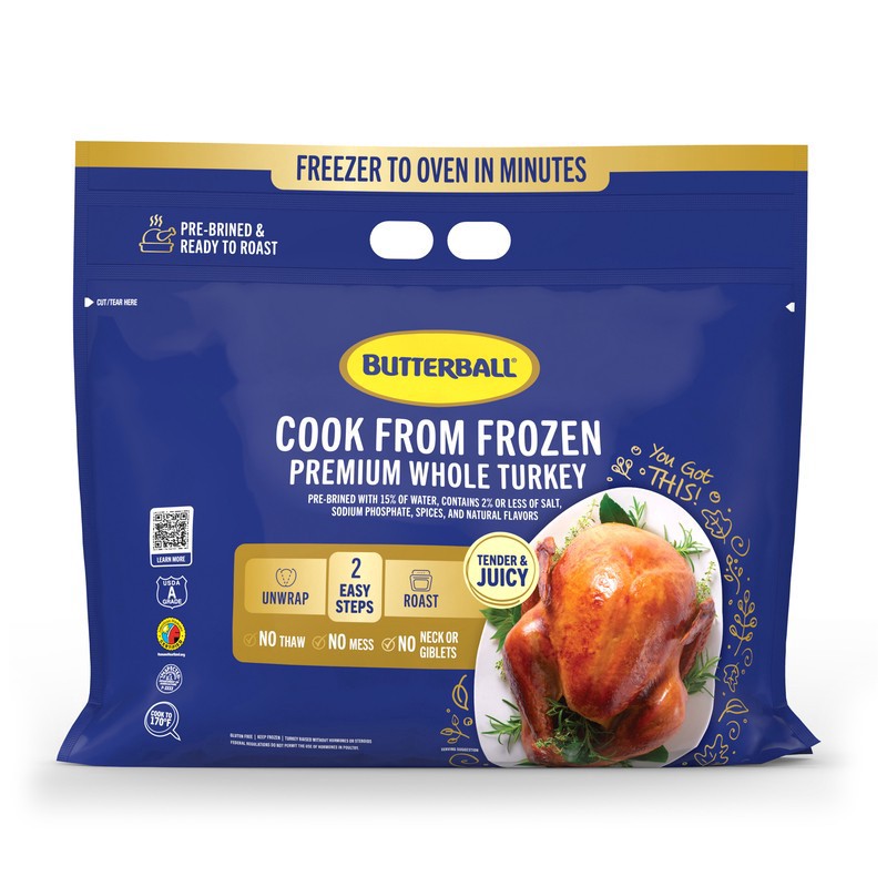 Butterball's Cook from Frozen Whole Turkey revolutionizes holiday prep. Thanks to a specially formulated brine, this premium turkey roasts straight from the freezer to golden-brown, tender, juicy perf…