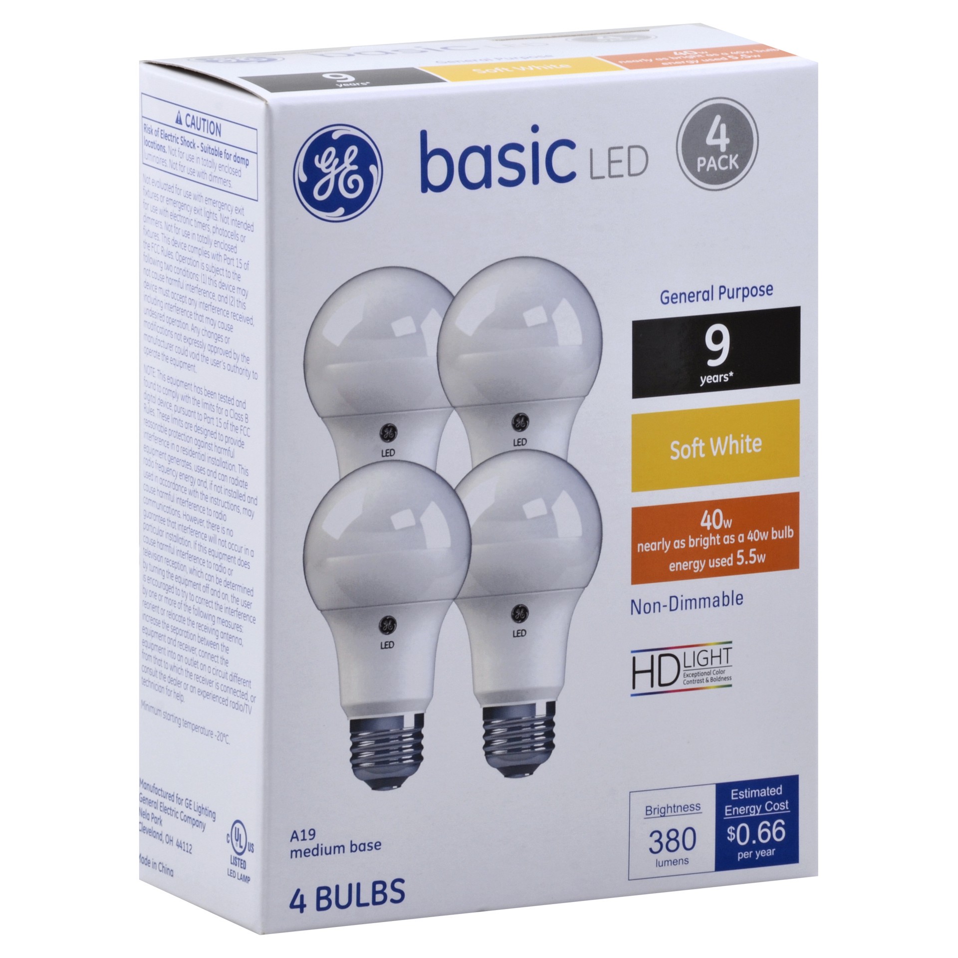 Brightness Quality: 380 Lumens. Energy Info: $0.66 based on 3 hrs/day, 11 cents/kWh. Cost depends on rates and use. 5.5 Watts. 120 Volts. Package Info: 4-Pack 4 Bulb Info: LED Medium. Bulb Life: 9.1 Y…