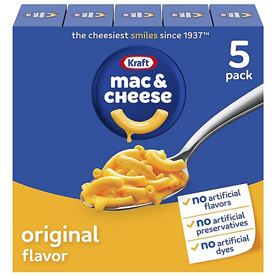Help yourself to a bowl of comfort. Kraft Original Mac and Cheese Dinner is a convenient boxed dinner. Kids and adults love the delicious taste of macaroni with cheesy goodness. Each 7.25 ounce mac n …