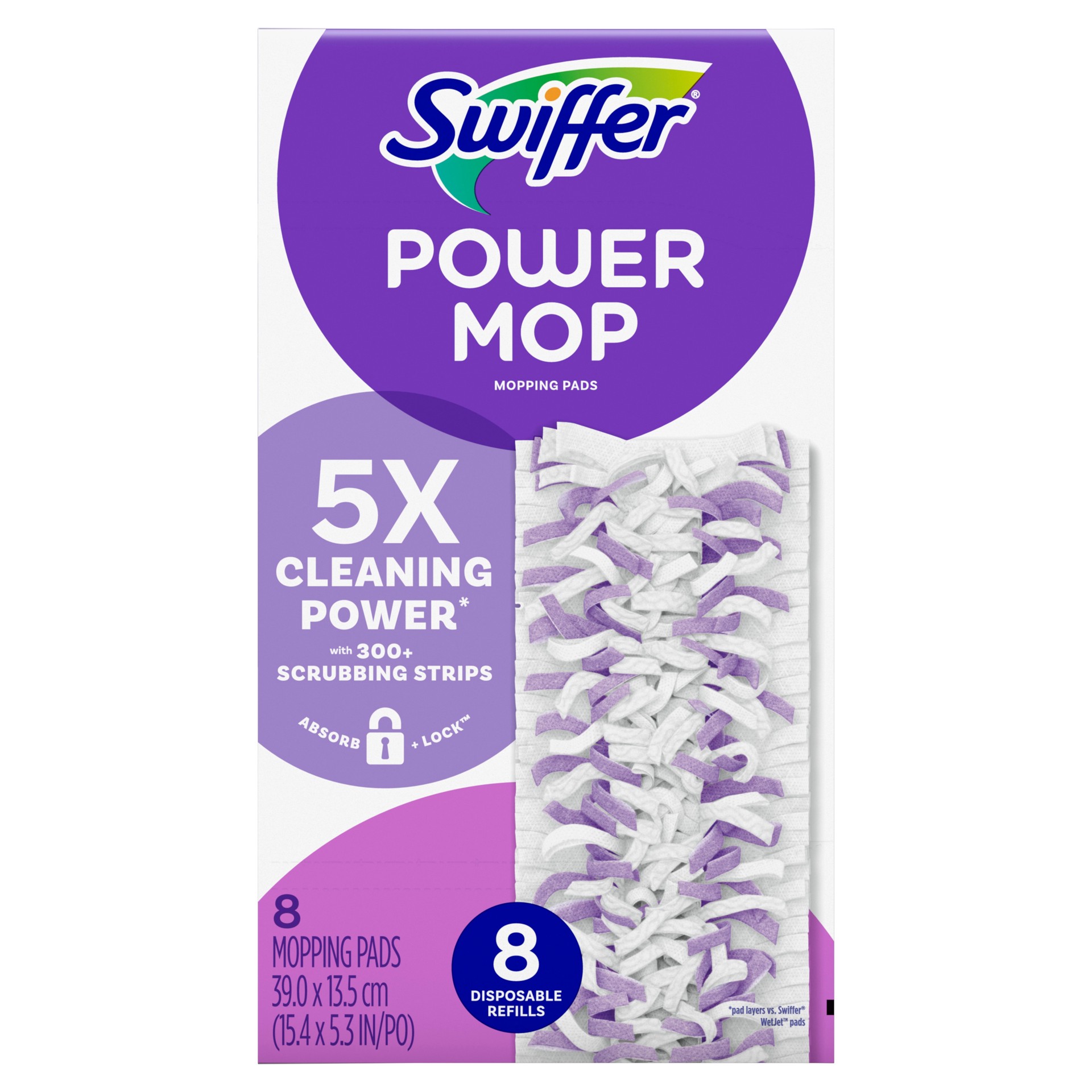 Includes 8 PowerMop Multi-Surface Mopping Pad Refills. 5X cleaning power (Pad layers vs Swiffer WetJet pads) with hundreds of scrubbing strips that fit deep into tough to reach places. Scrubbing strip…