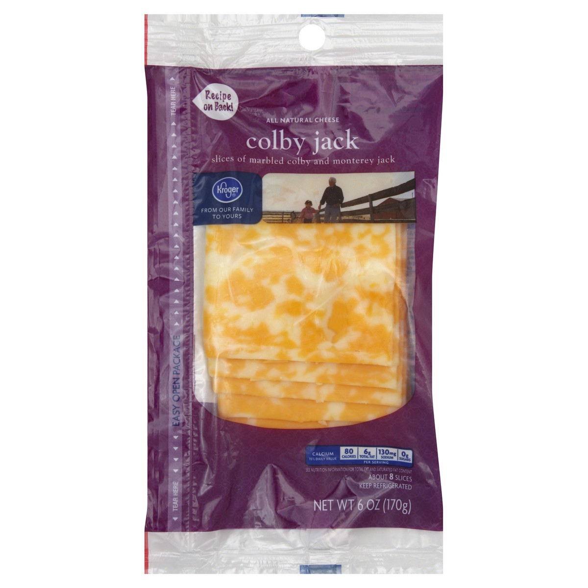 All natural cheese. Slices of marbled colby and monterey jack. From our family to yours. Calcium 15% daily value. 80 calories, 6 g total fat, 130 mg sodium, 0 g sugars per serving. About 8 slices. Kro…