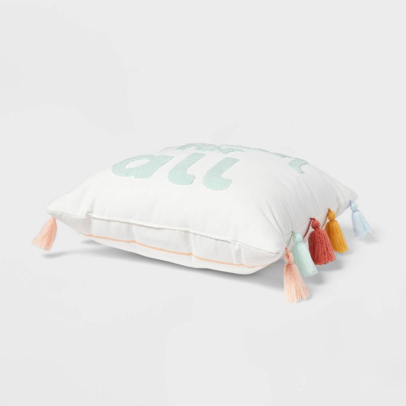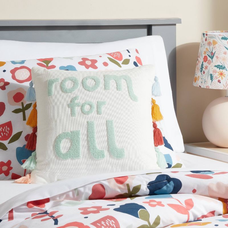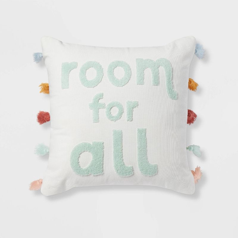 Bring a fun update to your kid's room decor with the Room for All Decorative Pillow from Pillowfort™. This square pillow features the message "Room for All" written in a sea green color with embroider…
