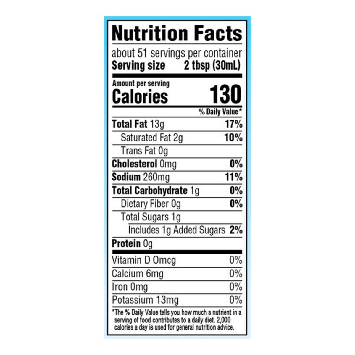Vegetable Oil (Soybean and/or Canola), Water, Buttermilk, Sugar, Salt, Less than 1% of: Spices, Garlic (Dried), Onion (Dried), Vinegar, Phosphoric Acid, Xanthan Gum, Monosodium Glutamate, Natural Flav…