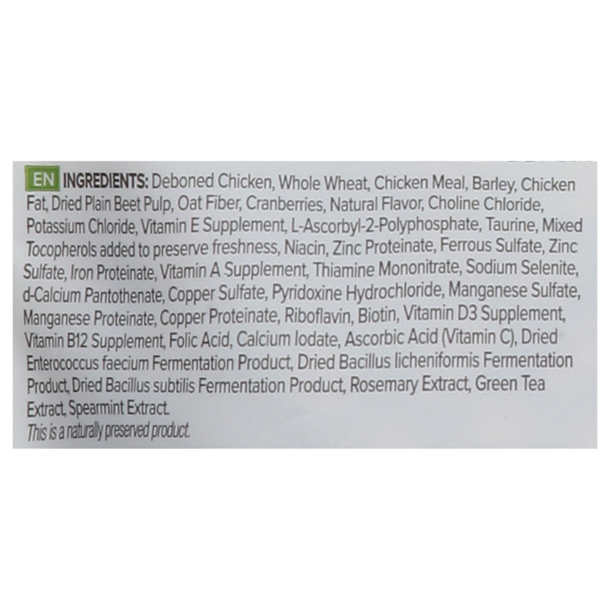 Deboned Chicken, Whole Wheat, Chicken Meal, Barley, Chicken Fat, Dried Plain Beet Pulp, Oat Fiber, Cranberries, Natural Flavor, Choline Chloride, Potassium Chloride, Vitamin E Supplement, L-Ascorbyl-2…