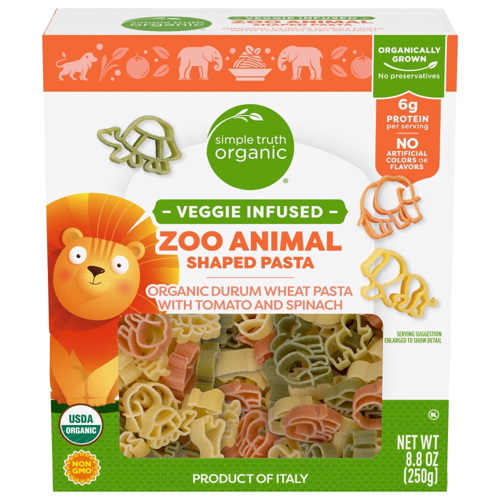 Simple Truth Organic® Veggie Infused Zoo Animal Shaped Pasta is crafted from organic durum wheat pasta with tomato and spinach. With 6g protein per serving, this pasta is also USDA organic and non-GMO…