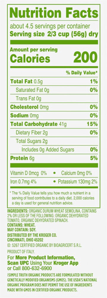 Organic Durum Wheat Semolina, Contains 2% Or Less Of The Following: Organic Dehydrated Tomato, Organic Dehydrated Spinach.