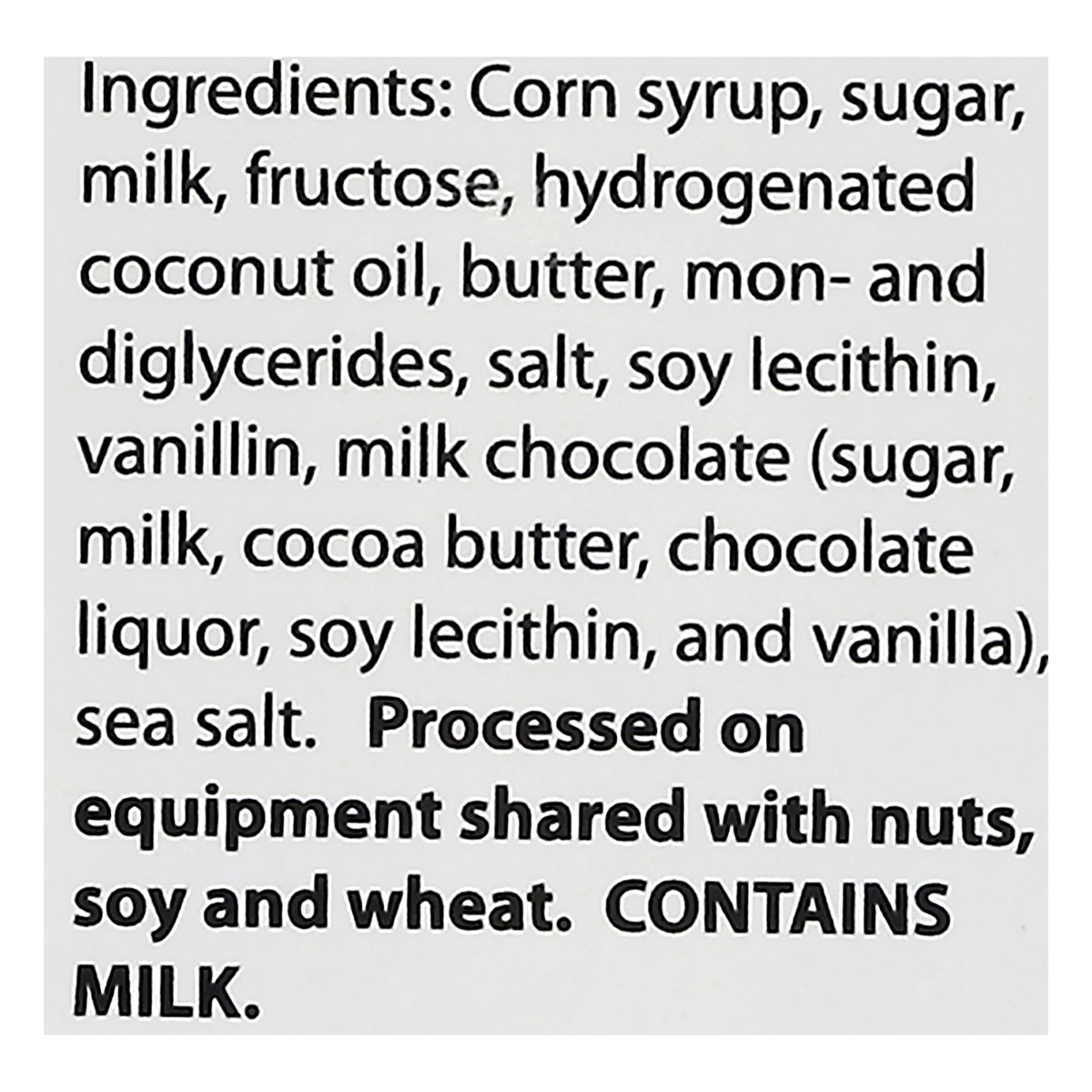 Corn Syrup, Sugar, Milk, Fructose, Hydrogenated Coconut Oil, Butter, Mono- and Diglycerides, Salt, Soy Lecithin, Vanillin, Milk Chocolate (Sugar, Milk, Cocoa Butter, Chocolate Liquor, Soy Lecithin, an…