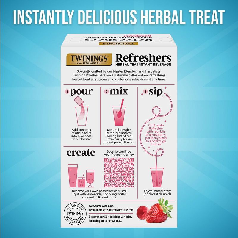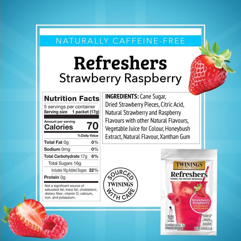 - CAFÉ-STYLE REFRESHER: a box of 5 Strawberry Raspberry Refreshers herbal tea instant beverages, by Twinings. A naturally caffeine-free treat that's convenient and affordable!