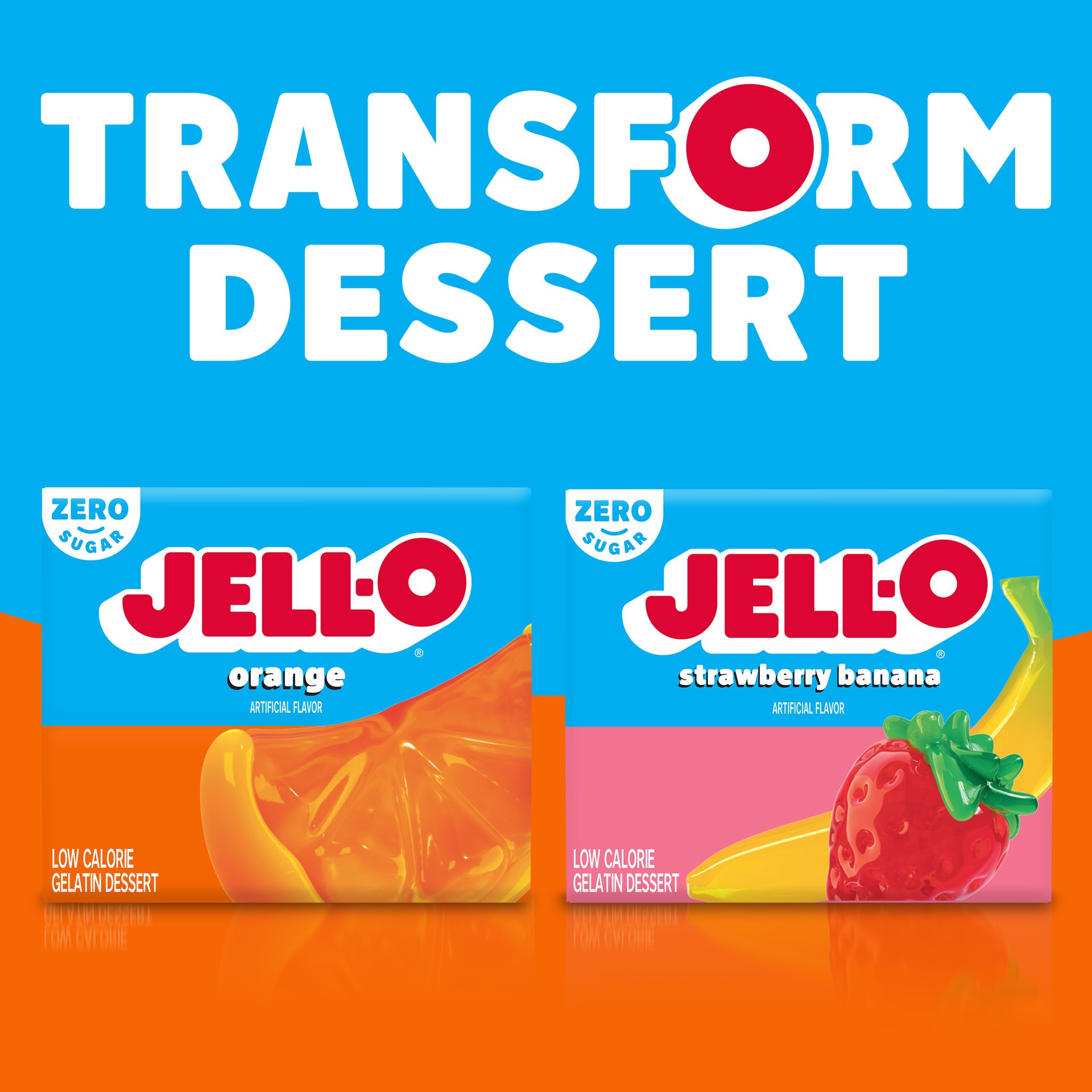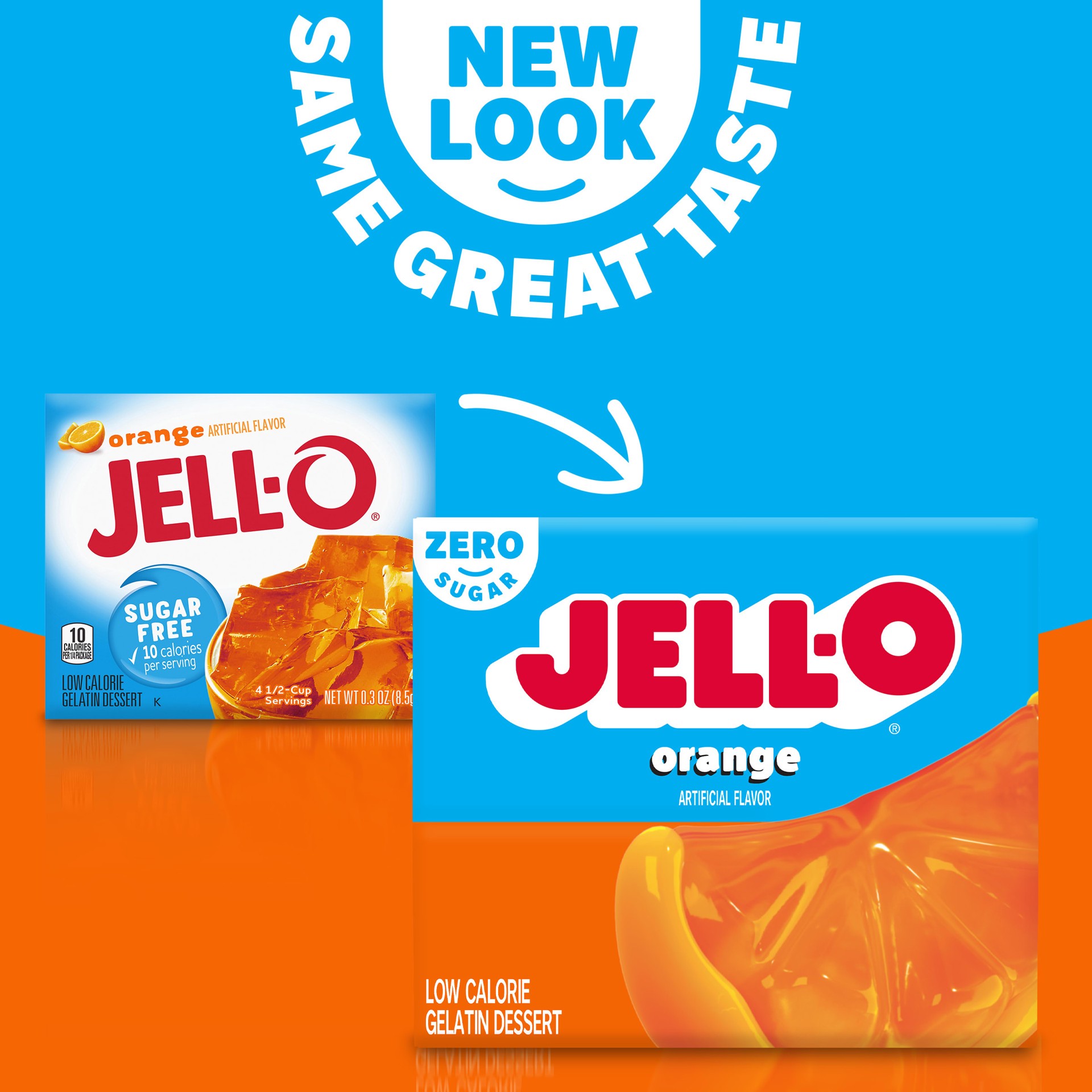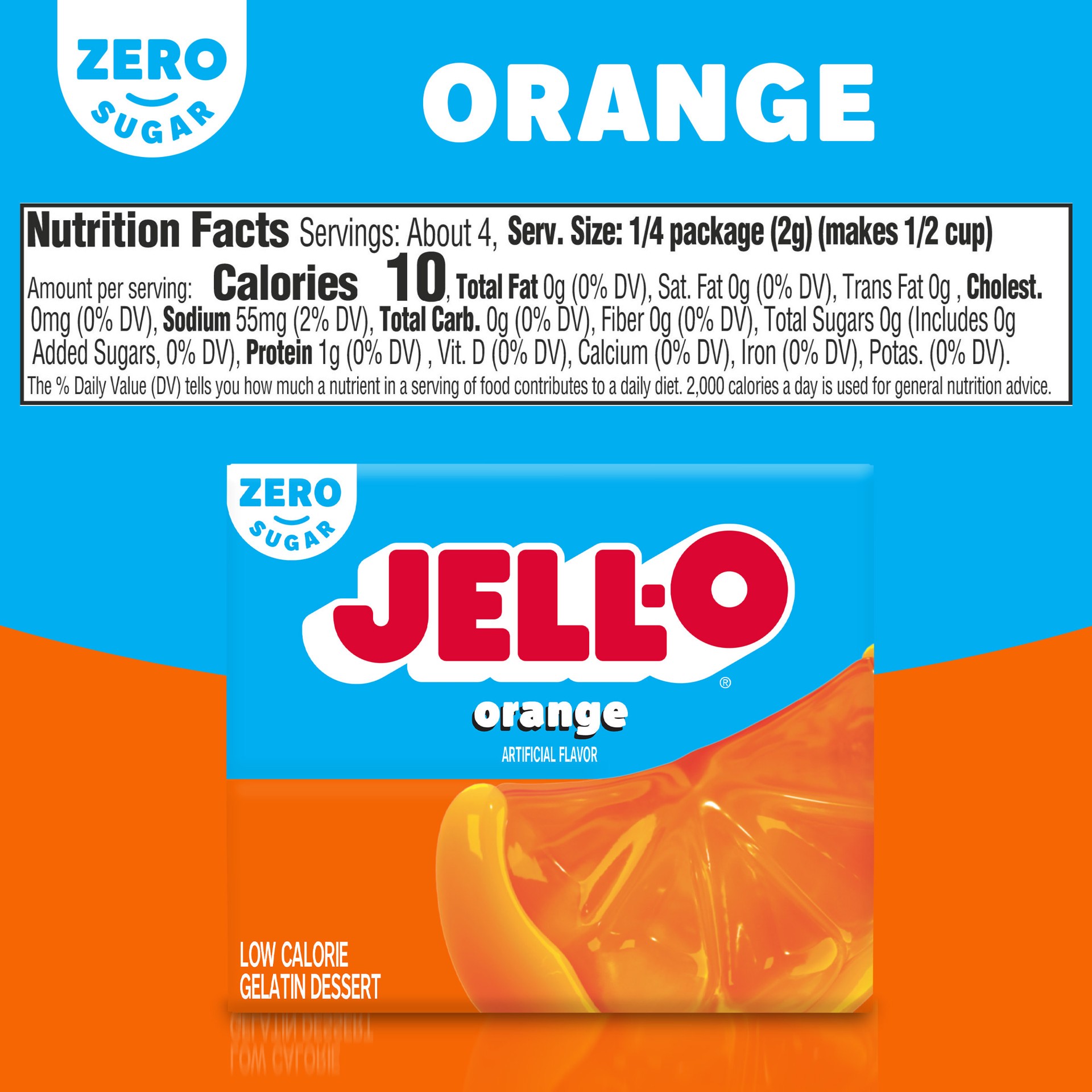 Snack happy. Jell-O Orange Artificially Flavored Zero Sugar Low Calorie Gelatin Dessert Mix lets you add some wonder to your day with a fun snack. Spoon up a smile with our zero sugar artificially fla…