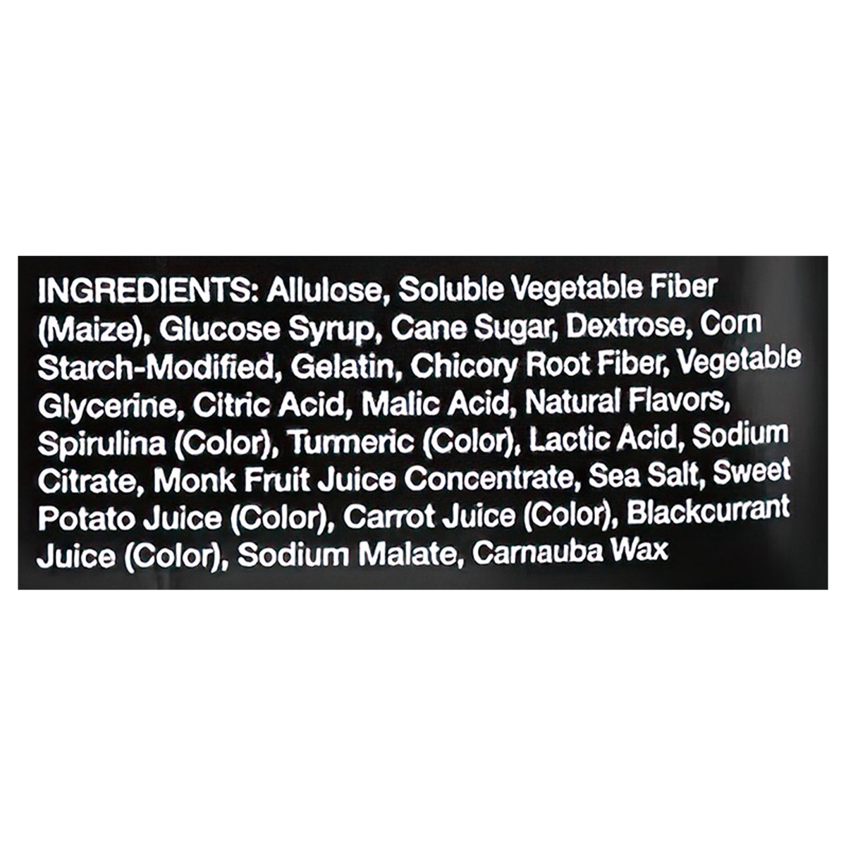 Allulose, Soluble Vegetable Fiber (Maize), Glucose Syrup, Cane Sugar, Dextrose, Corn Starch-Modified, Gelatin, Chicory Root Fiber, Vegetable Glycerine, Citric Acid, Malic Acid, Natural Flavors, Spirul…