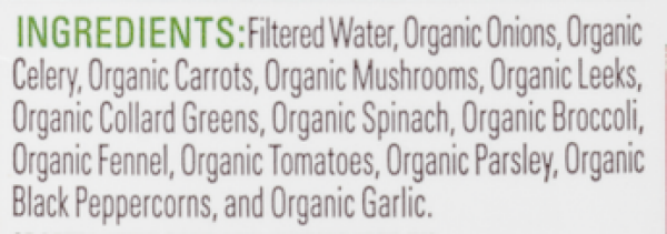 Filtered Water, Organic Onions, Organic Celery, Organic Carrots, Celtic Sea Salt, Organic Mushrooms, Organic Leeks, Organic Collard Greens, Organic Spinach, Organic Broccoli, Organic Fennel, Organic T…