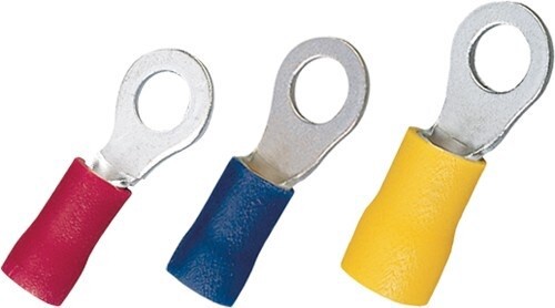 Red terminals will accept 22-16 AWG. Blue terminals will accept 16-14 AWG. Yellow terminals will accept 12-10 AWG. Tin-plated brass construction for corrosion resistance.