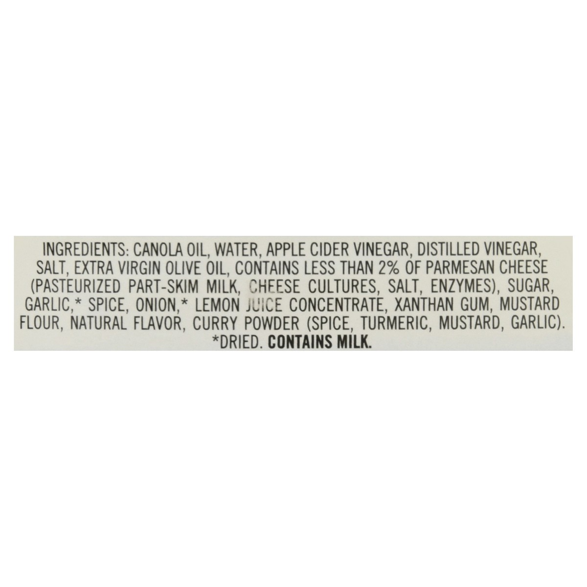 Canola Oil, Water, Apple Cider Vinegar, Distilled Vinegar, Salt, Extra Virgin Olive Oil, Contains Less than 2% of Parmesan Cheese (Pasteurized Part-Skim Milk, Cheese Cultures, Salt, Enzymes), Sugar, G…