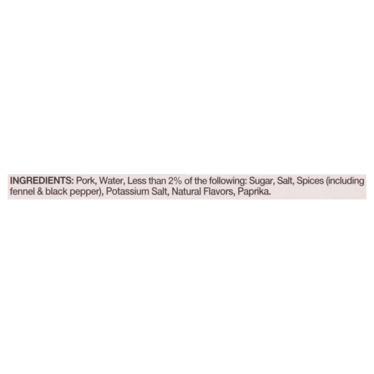 Pork, Water, Less than 2% of the Following: Sugar, Salt, Spices (Including Fennel & Black Pepper), Potassium Salt, Natural Flavors, Paprika.