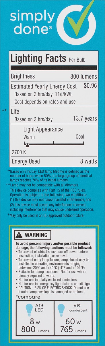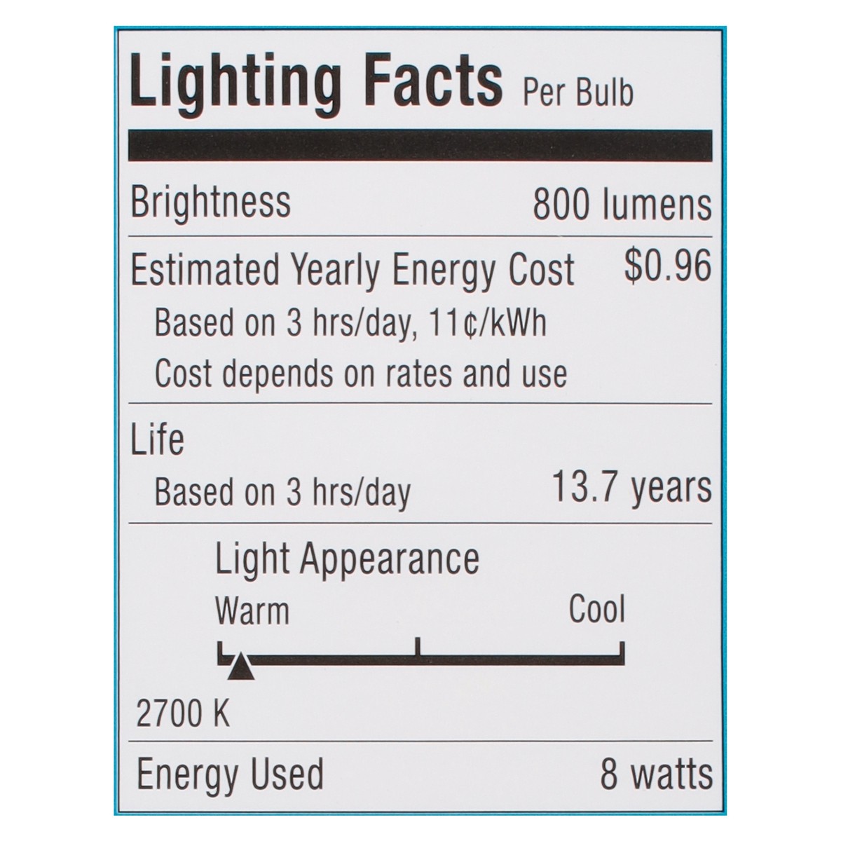 Brightness Quantity: 800 lumens. Energy Info: $0.96 Based on 3 hrs/day, 11 cents/kWh. Cost depends on rates and use. 8 watts. Package Info: 4-Pack. 4. Bulb Info: Both. LED. Is Dimmable. Has Energy Sta…