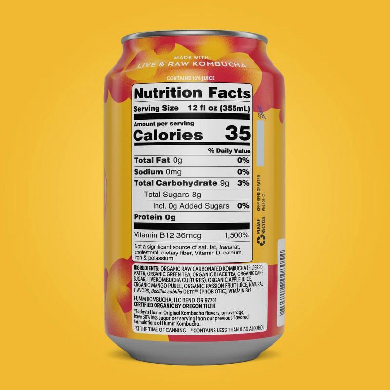 ingredients: organic raw carbonated kombucha (filtered water, organic green tea, organic black tea, organic cane sugar, live kombucha cultures), organic apple juice, organic mango puree, organic passi…