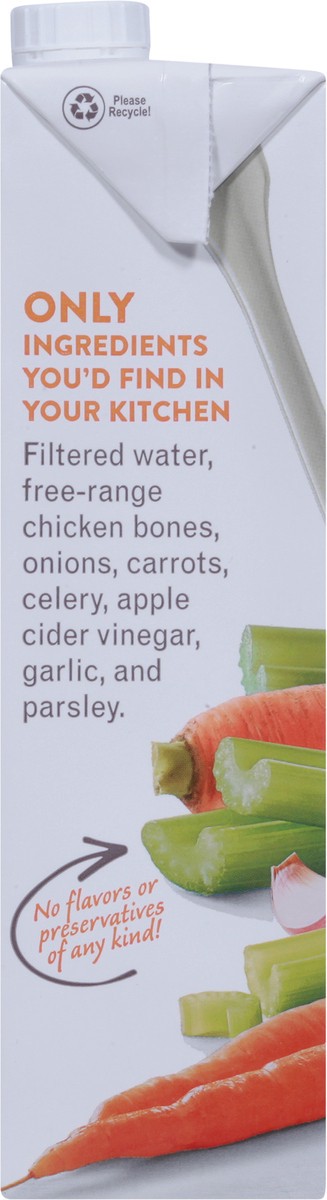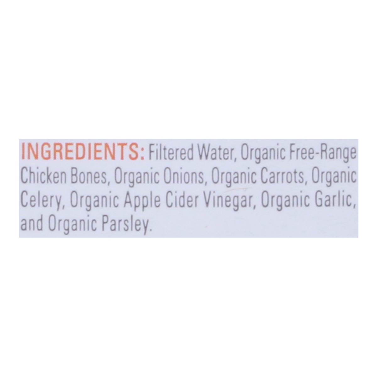 Filtered Water, Organic Free-Range Chicken Bones, Organic Onions, Organic Carrots, Organic Celery, Organic Apple Cider Vinegar, Organic Garlic, and Organic Parsley.