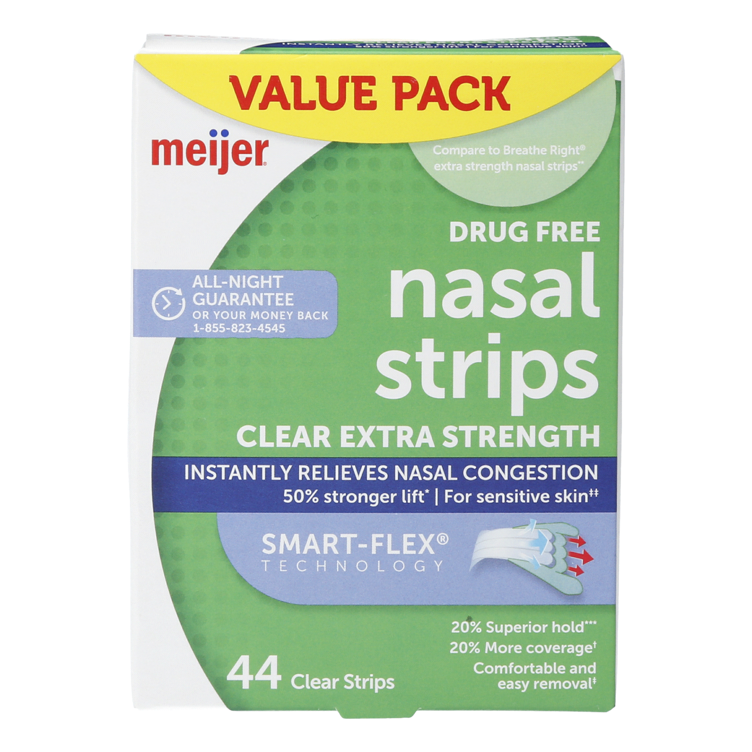 When your nose is stuffy, the most basic of tasks can be daunting. Meijer Extra Strength Nasal Strips open nasal passages for easier breathing.