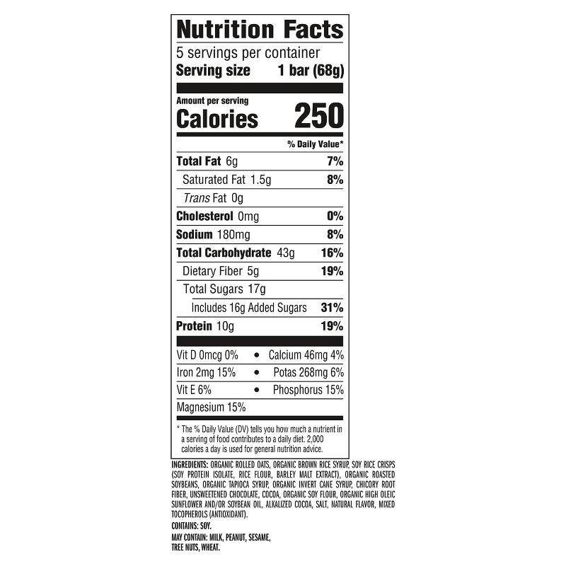 Organic Rolled Oats, Organic Brown Rice Syrup, Soy Rice Crisps (Soy Protein Isolate, Rice Flour, Barley Malt Extract), Organic Roasted Soybeans, Organic Tapioca Syrup, Organic Invert Cane Syrup, Chico…
