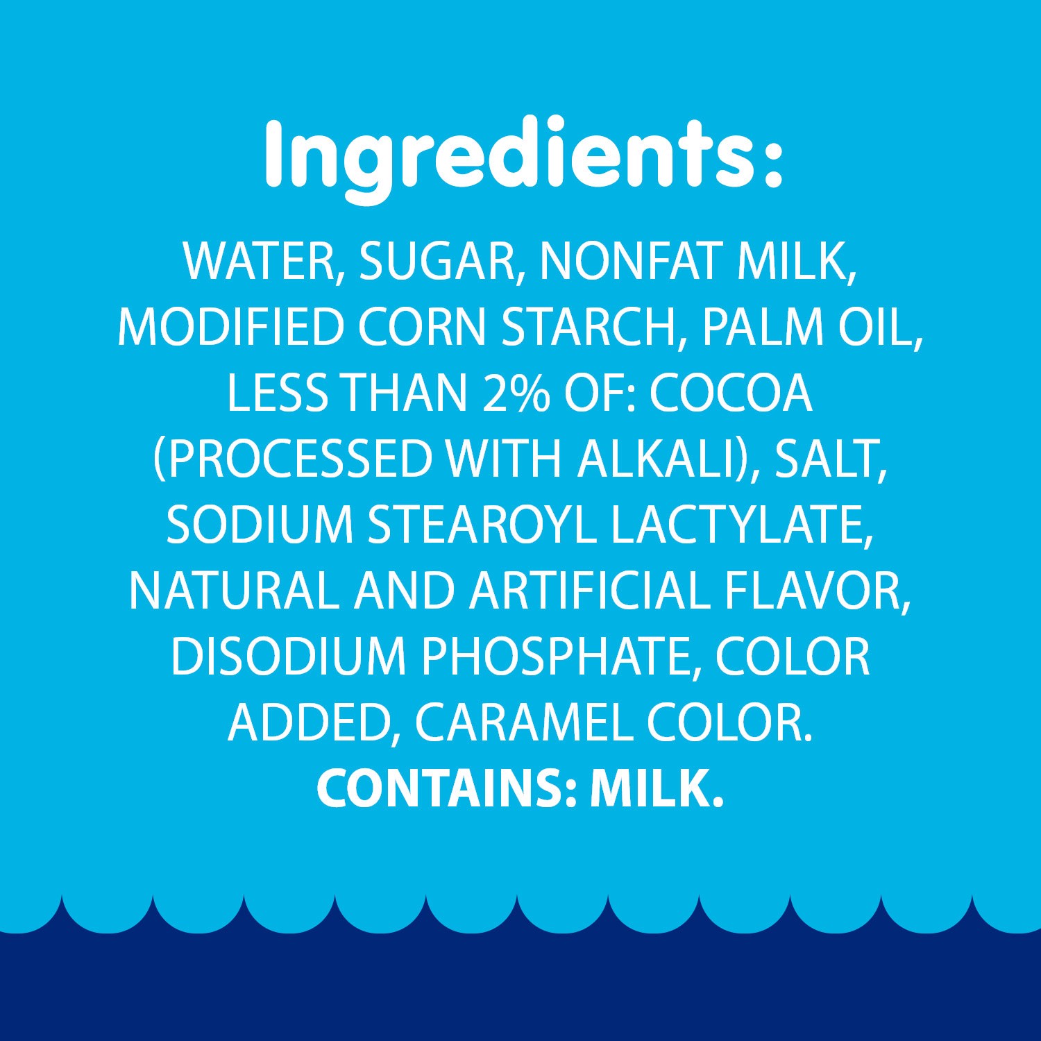 Water, Sugar, Nonfat Milk, Modified Corn Starch, Palm Oil, Less than 2% of: Cocoa (Processed with Alkali), Salt, Sodium Stearoyl Lactylate, Natural and Artificial Flavor, Disodium Phosphate, Color Add…