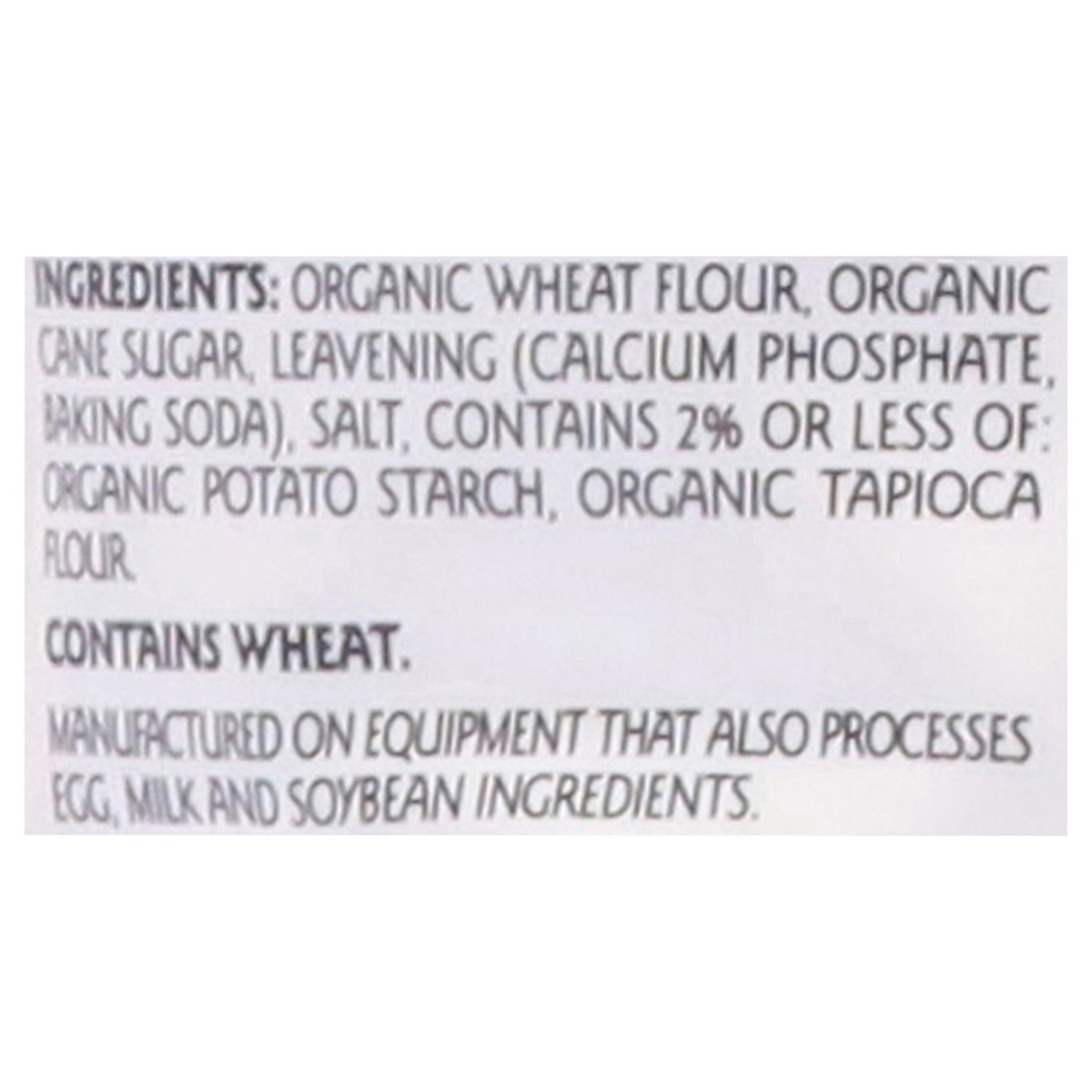 Organic Wheat Flour, Organic Cane Sugar, Leavening (Calcium Phosphate, Baking Soda), Salt, Contains 2% or Less of: Organic Potato Starch, Organic Tapioca Flour.