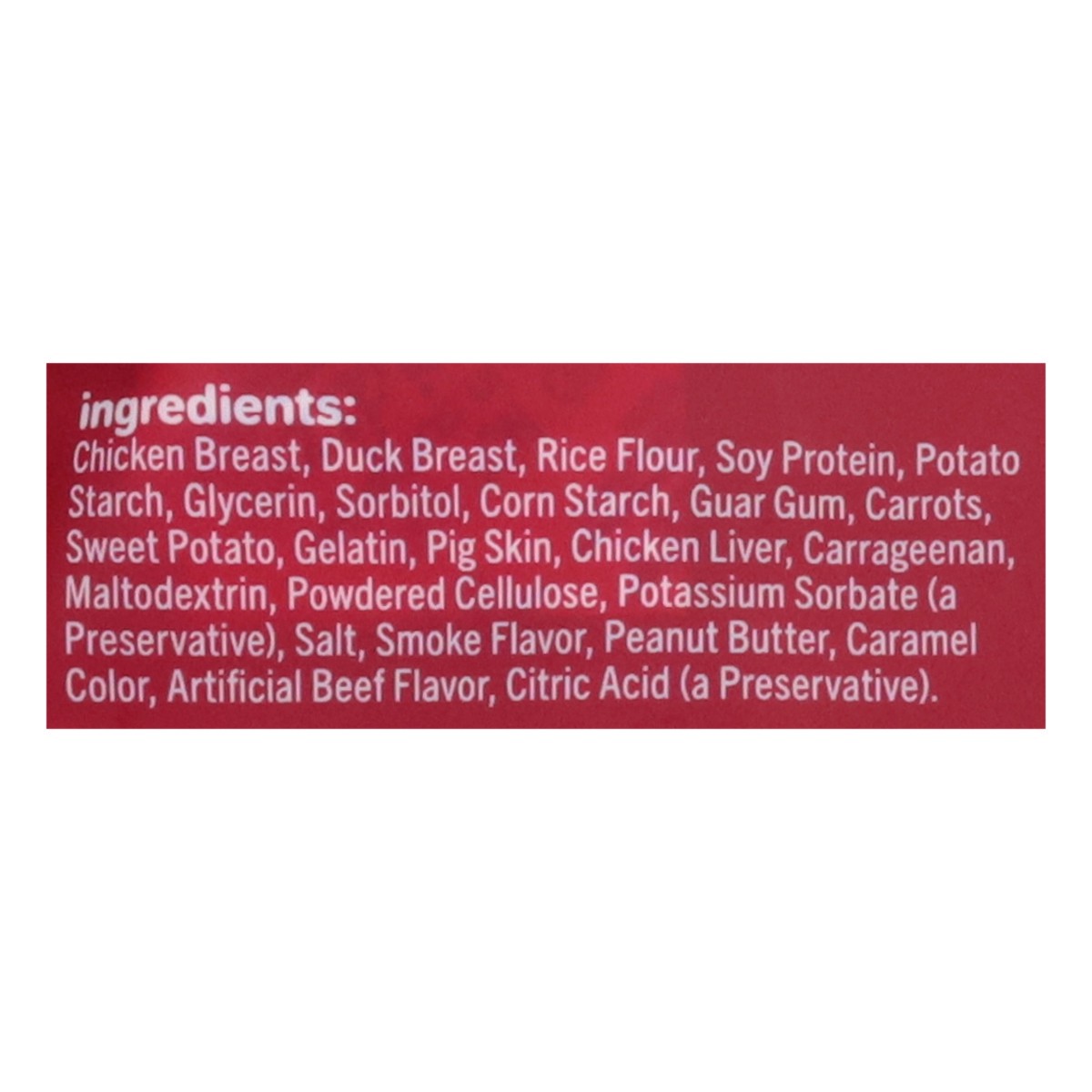 Chicken Breast, Duck Breast, Rice Flour, Soy Protein, Potato Starch, Glycerin, Sorbitol, Corn Starch, Guar Gum, Carrots, Sweet Potato, Gelatin, Pig Skin, Chicken Liver, Carrageenan, Maltodextrin, Powd…