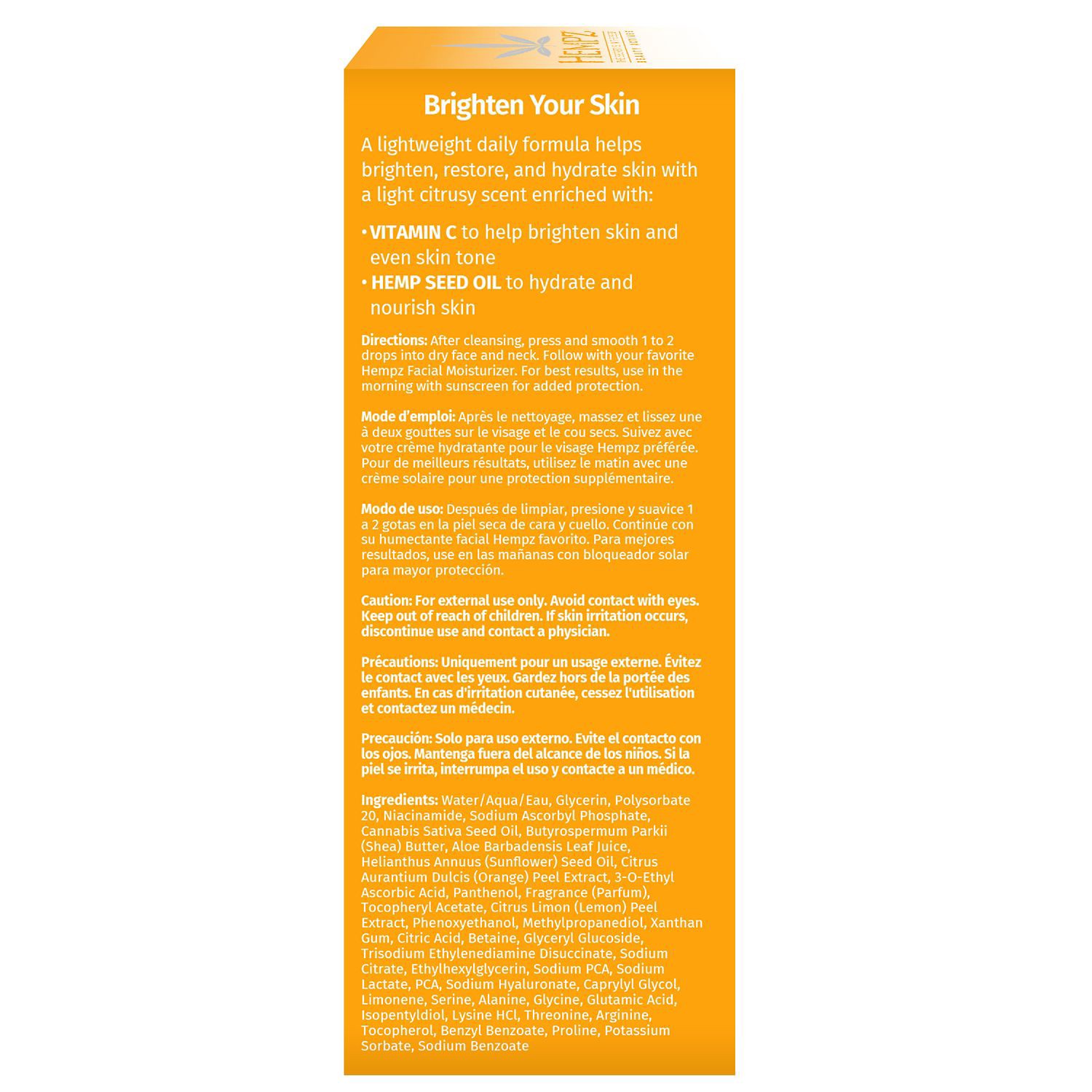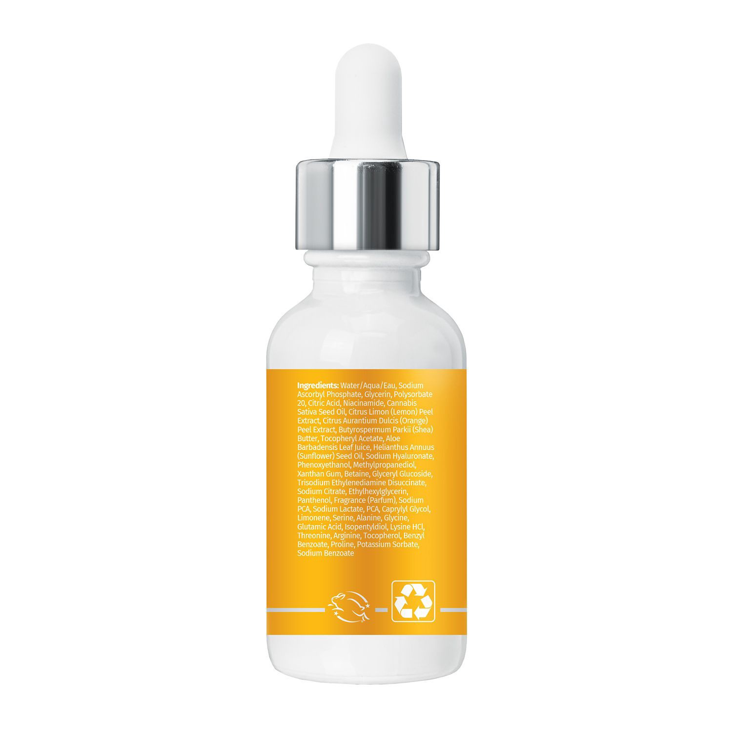 Water/Aqua/Eau, Glycereth-7 Triacetate, Methylpropanediol, Glycerin, Propanediol, Polysorbate 20, Cannabis Sativa Seed Oil, Water/Aqua/Eau, Glycerin, Polysorbate 20, Niacinamide, Sodium Ascorbyl Phosp…