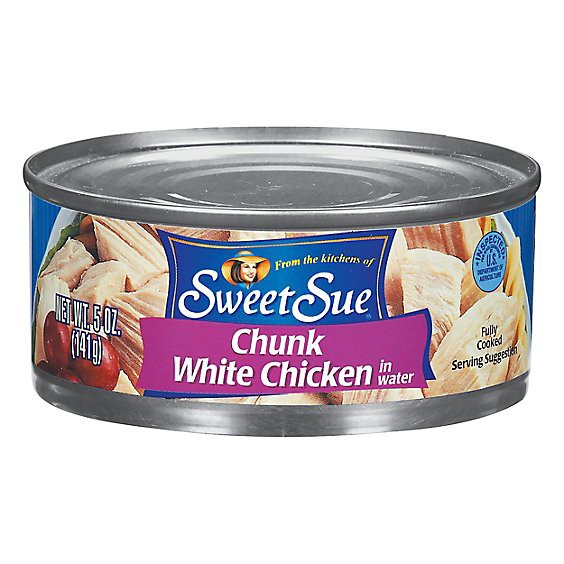 Chunk white chicken in water. From the kitchen of Sweet Sue. Fully cooked. Inspected for wholesomeness by U.S. Department of Agriculture. Questions or comments? Call 1-800-633-3294. Please recycle whe…