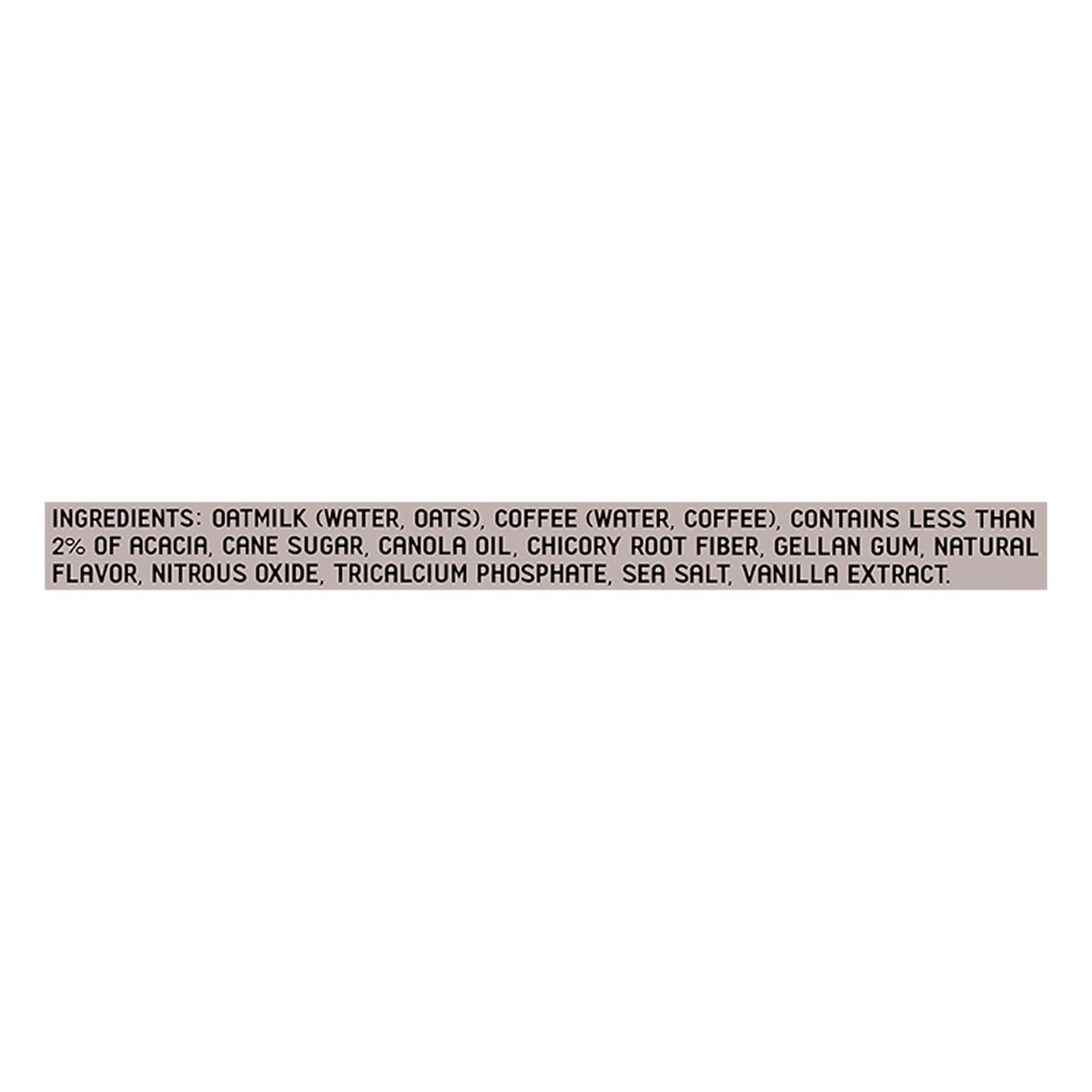 Oatmilk (Water, Oats), Coffee (Water, Coffee), Contains Less than 2% of Acacia, Cane Sugar, Canola Oil, Chicory Root Fiber, Gellan Gum, Natural Flavor, Nitrous Oxide, Tricalcium Phosphate, Sea Salt, V…