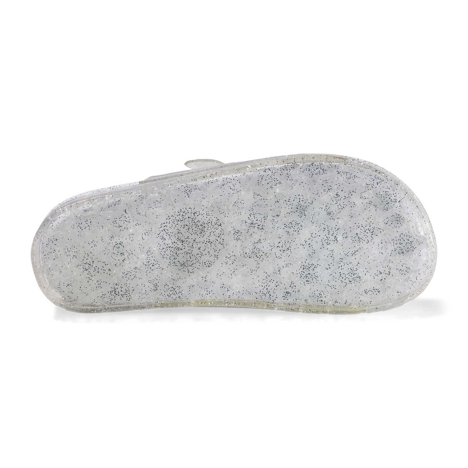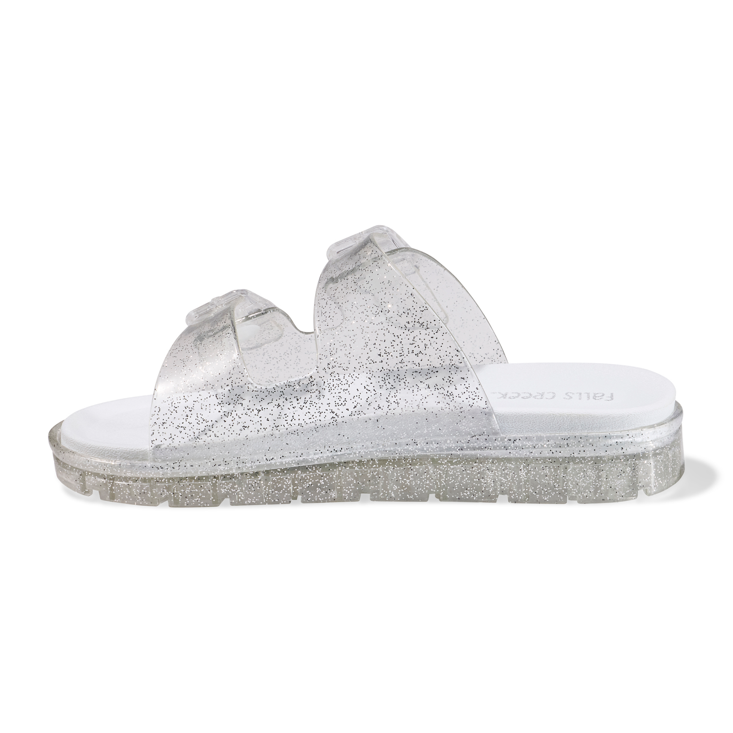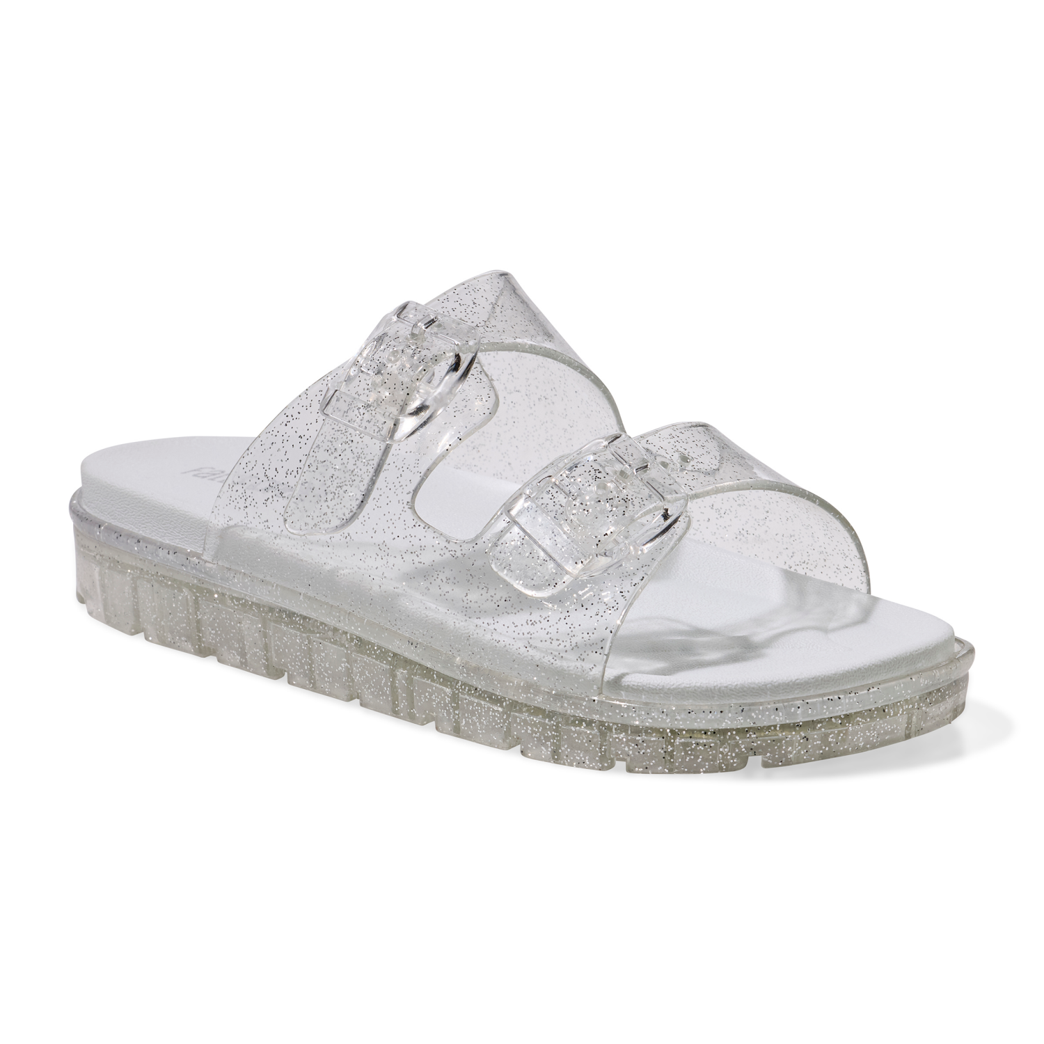 Clear Glitter Jelly buckled slide sandals brings the celebration vibes wherever they go! Multi-colored PVC with shiny glitter, two wide straps with buckles make this an easy pick.