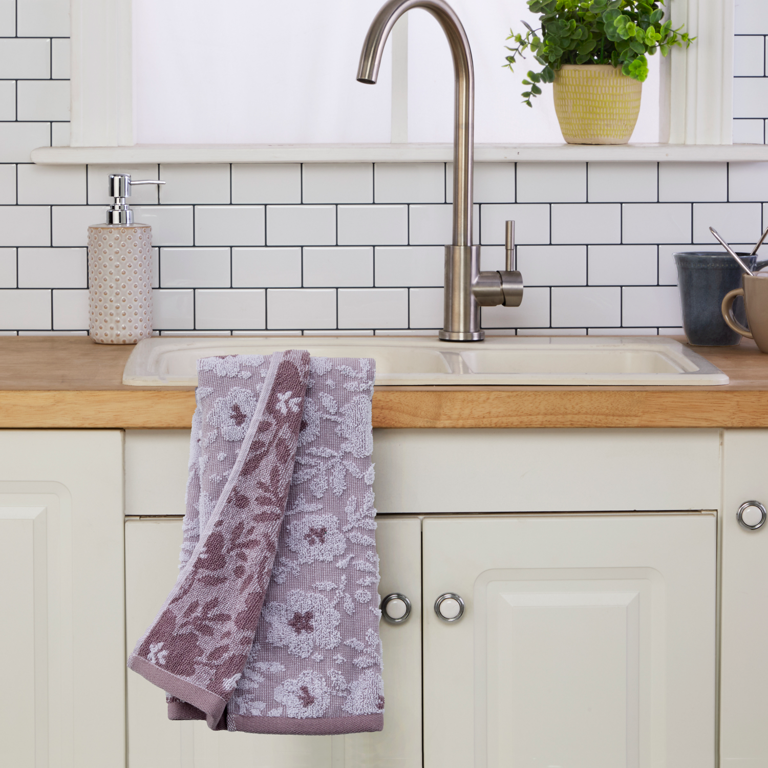 This hand towel is blooming with beauty. Made of soft and absorbent cotton terry, it features a tonal, textured floral jacquard pattern. It can be used in the bathroom, kitchen, bar area, or any sink …
