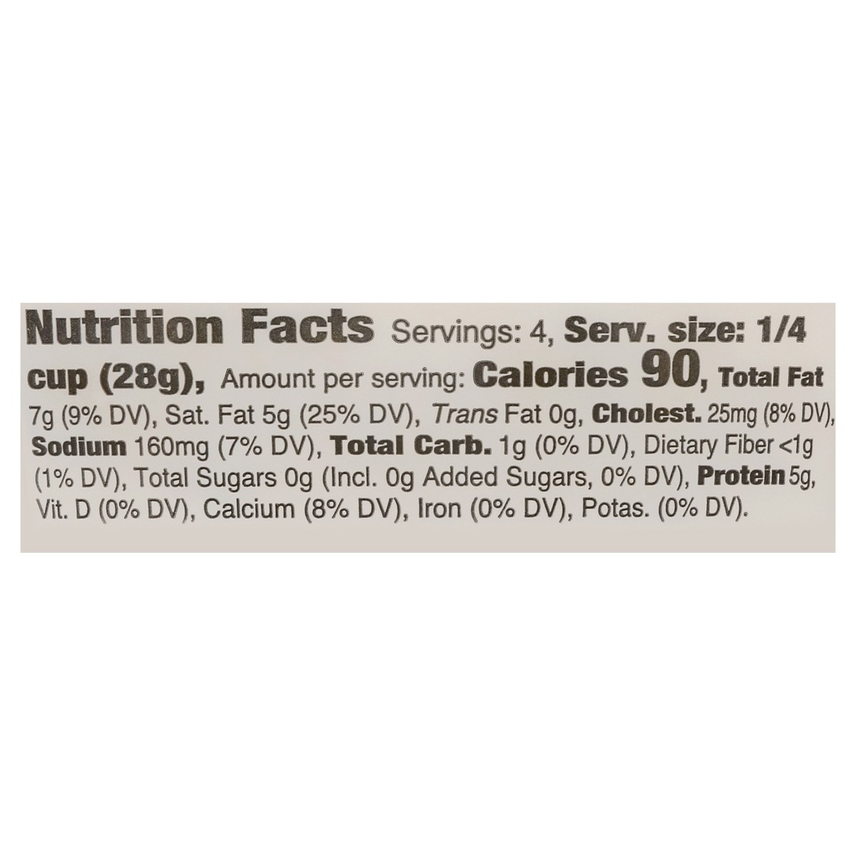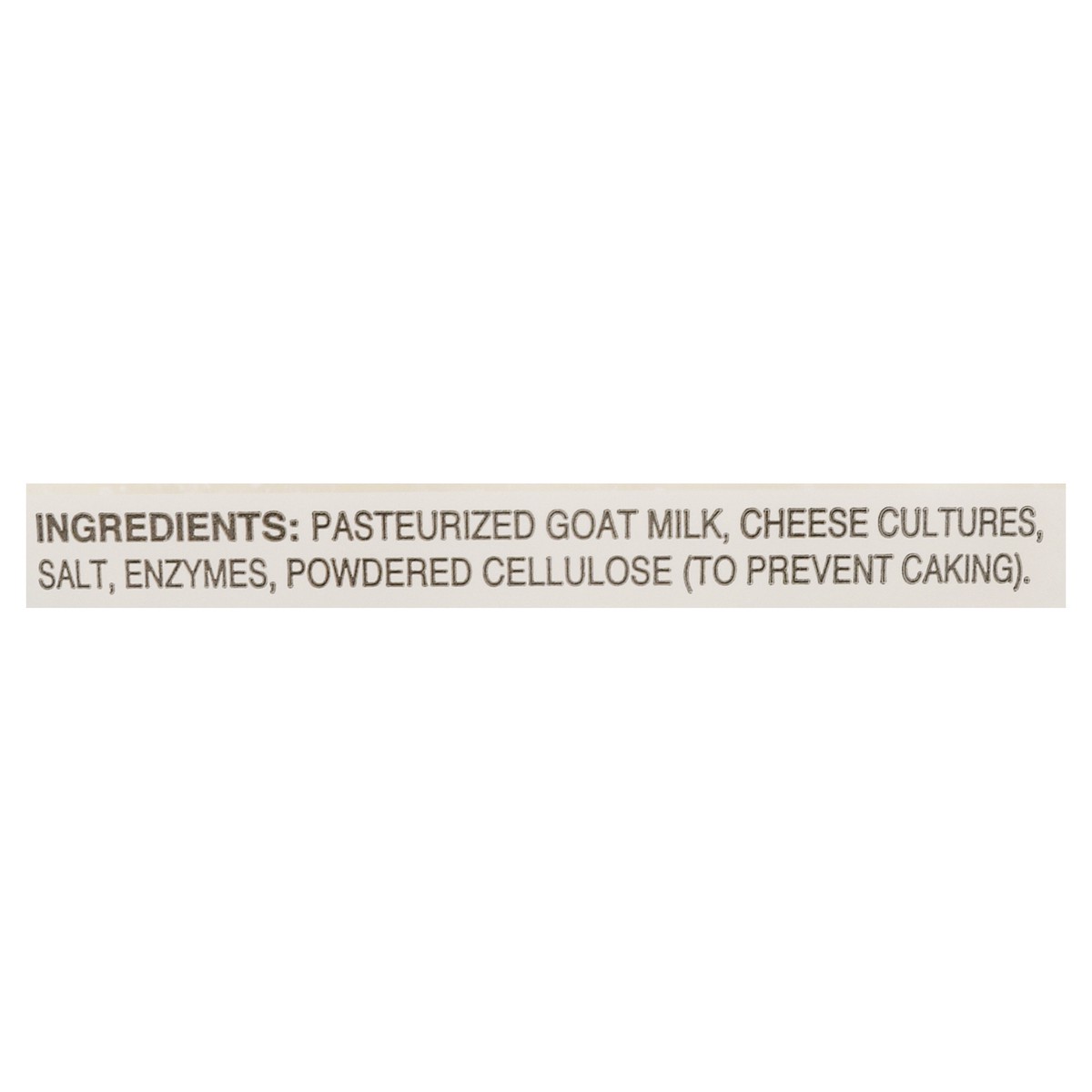 Whole Pasteurized Goat Milk, Cellulose (Anti-Caking), Salt, Cheese Cultures, Enzymes.