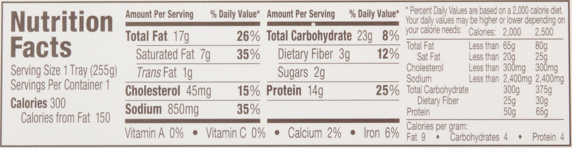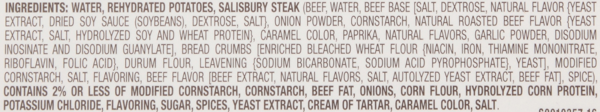 Ingredients: Rehydrated Potatoes (Water, Dehydrated Potatoes, Sodium Acid Pyrophosphate), Salisbury Steak (Beef, Water, Beef Base [Salt, Dextrose, Natural Flavor (Yeast Extract, Dried Soy Sauce, Dextr…