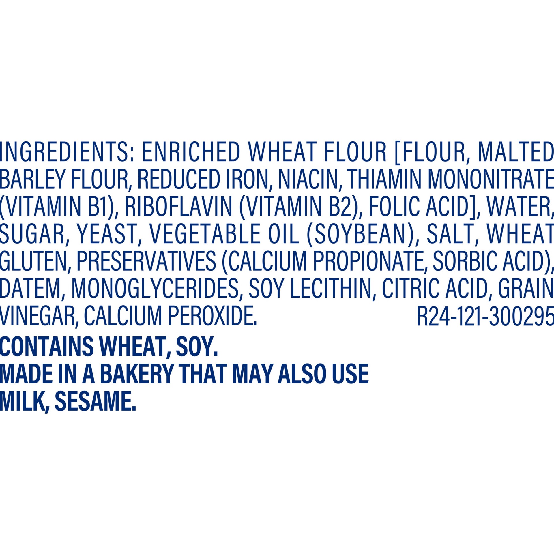 Enriched Wheat Flour [Flour, Malted Barley Flour, Reduced Iron, Niacin, Thiamin Mononitrate (Vitamin B1), Riboflavin (Vitamin B2), Folic Acid], Water, Sugar, Yeast, Vegetable Oil (Soybean), Salt, Whea…