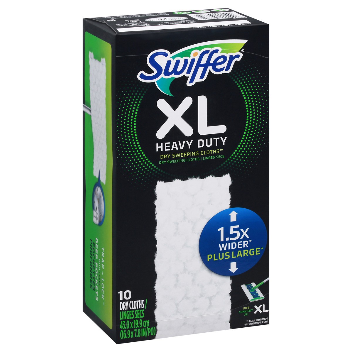 1.5 x wider (vs regular Swiffer Sweeper) plus large (vs regular Swiffer Sweeper). Trap + Lock with deep pockets. Pochettes. Fits XL.