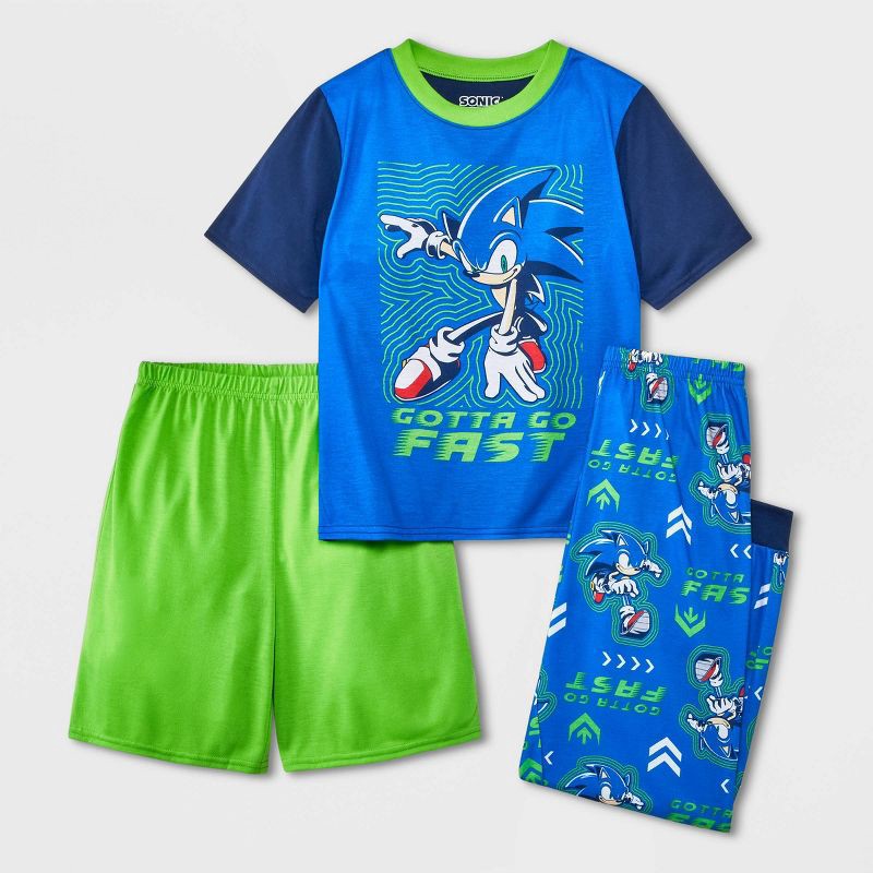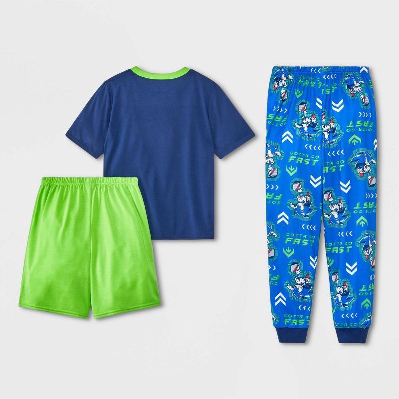 Level up the style of your child's pajamas with this Sonic the Hedgehog 3-Piece Pajama Set. This sleepwear set includes a short-sleeve tee and coordinating PJ pants in bright blue and navy featuring c…