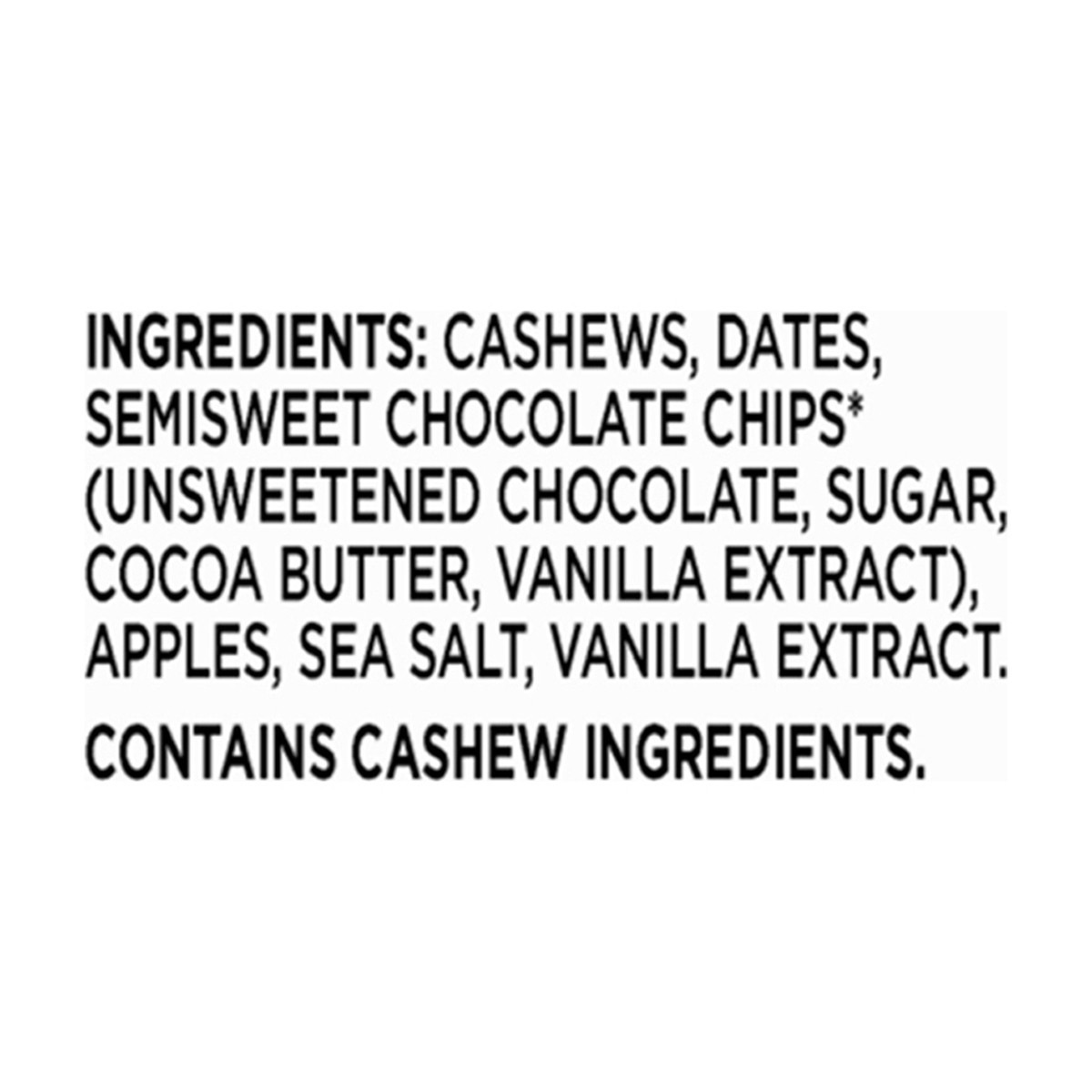 Cashews, Dates, Semisweet Chocolate Chips* (Unsweetened Chocolate, Sugar, Cocoa Butter, Vanilla Extract), Apples, Sea Salt, Vanilla Extract. * Fair Trade Certified by Fair Trade USA. At Least 20% Fair…