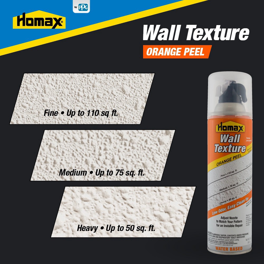 Water-based aerosol formula. Patches orange peel and splatter textures. Adjusts to spray fine to heavy orange peel textures. Low odor, ideal for working in occupied spaces. Match existing interior wal…